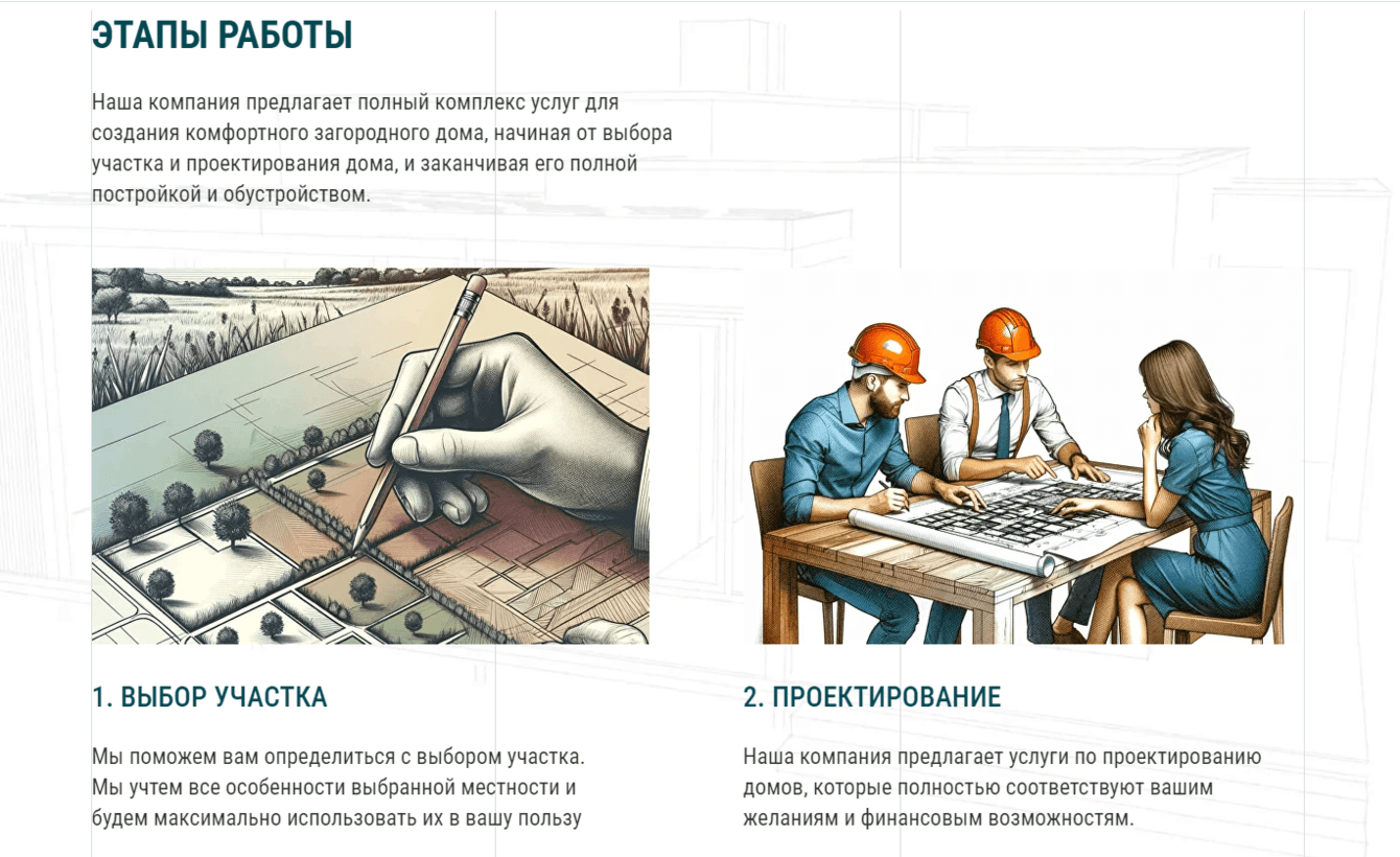 Мы провели тщательный анализ конкурентов и изучили тренды дизайна строительных сайтов как в России, так и за рубежом. Это позволило нам выделить ключевые элементы для будущего сайта и решиться на использование современных чертежей как основы дизайна.