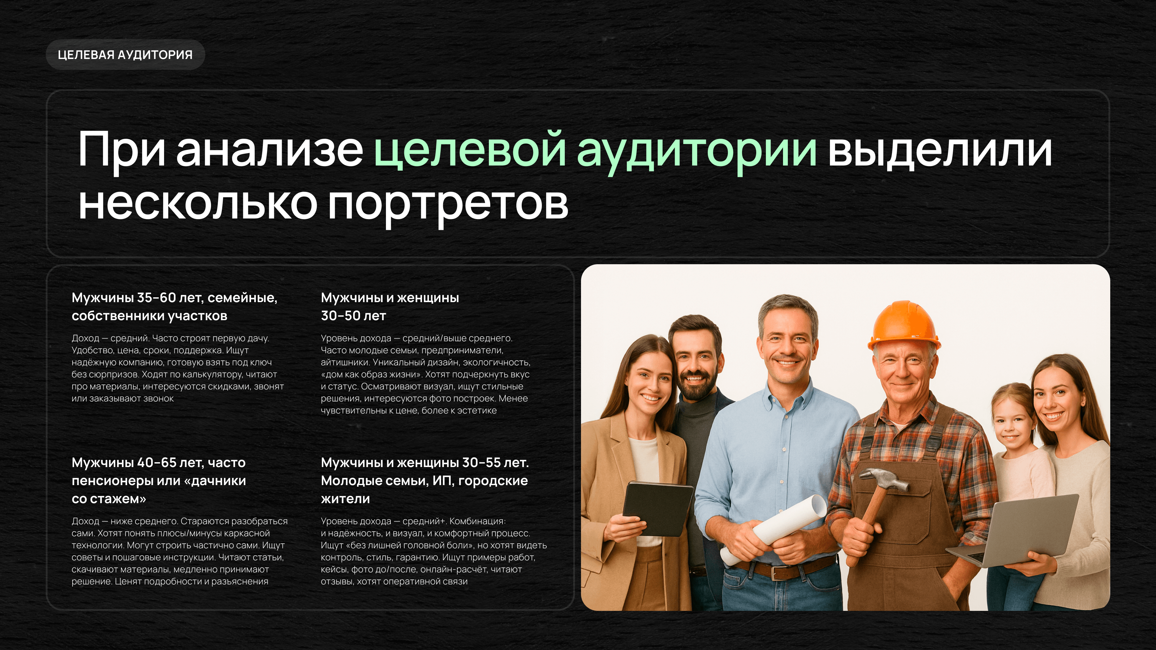 - Делают акцент на продукте (домах, банях) и ценах, но не все озвучивают стоимость, ведь каждый проект требует индивидуального расчёта