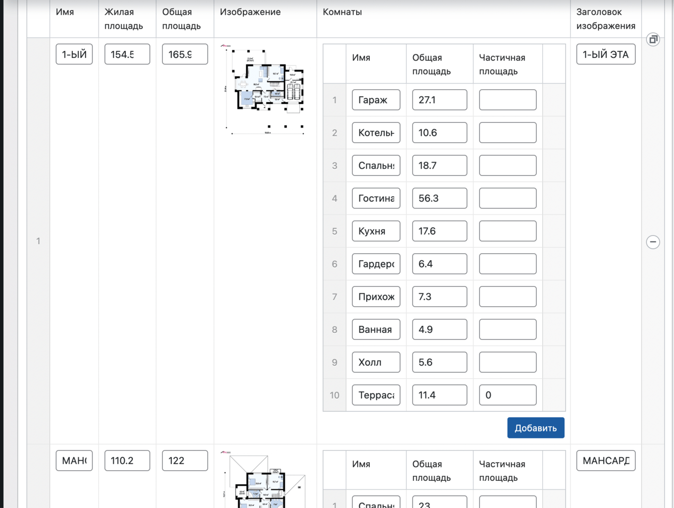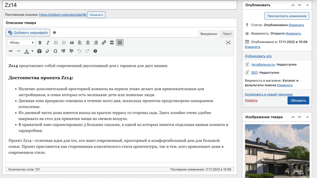 Каждый проект дома заведен в системе в качестве товара, что позволяет легко отредактировать любую информацию о нем
