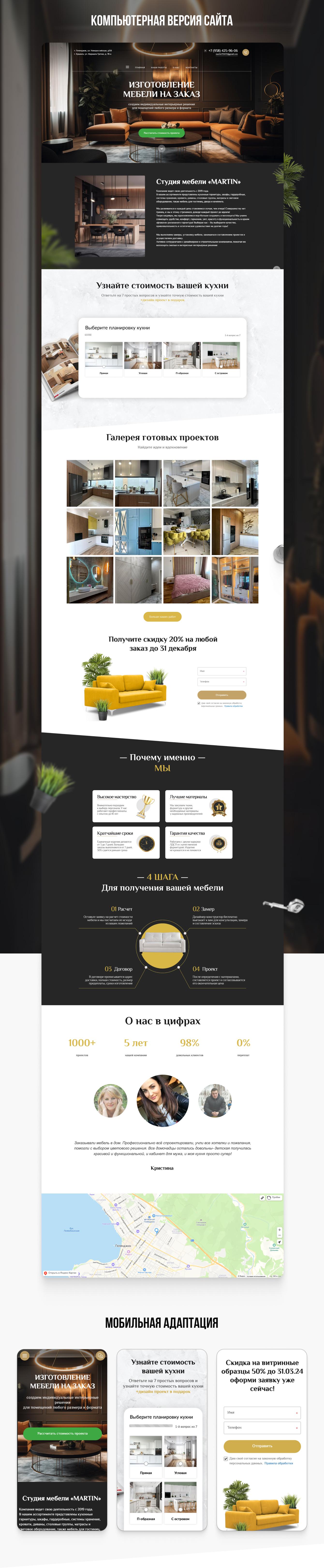 Акцент был сделан на выделении важных для клиента качеств кухни основанных на потребностях целевой аудитории. Проработан блок с квизом из 7 вопросов для увеличения заявок и продаж