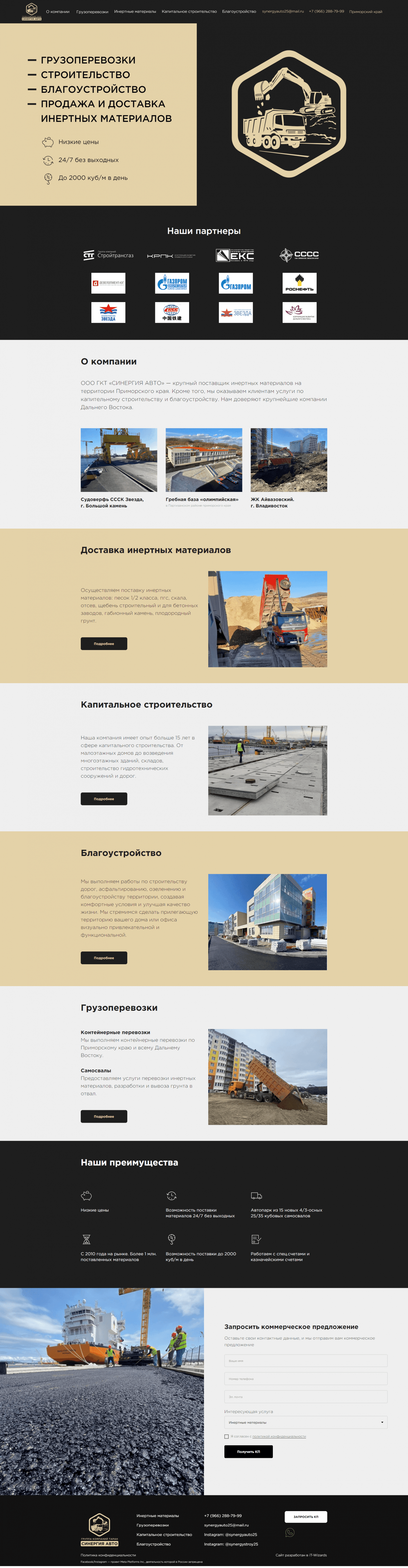 Недавно мы завершили работу над сайтом для компании, которая оказывает широкий спектр услуг в различных сферах, включая грузоперевозки, строительство, благоустройство, продажу и доставку инертных материалов.