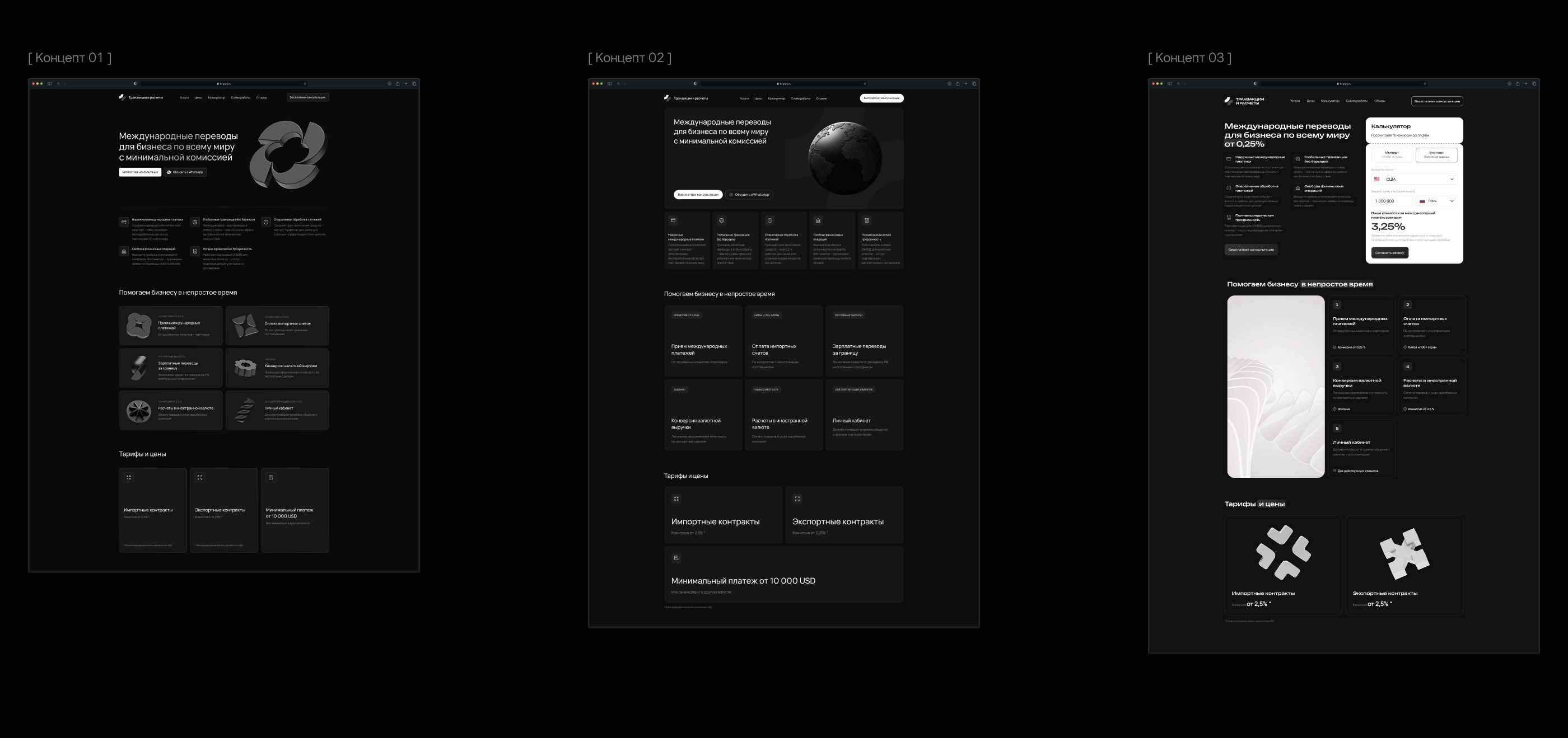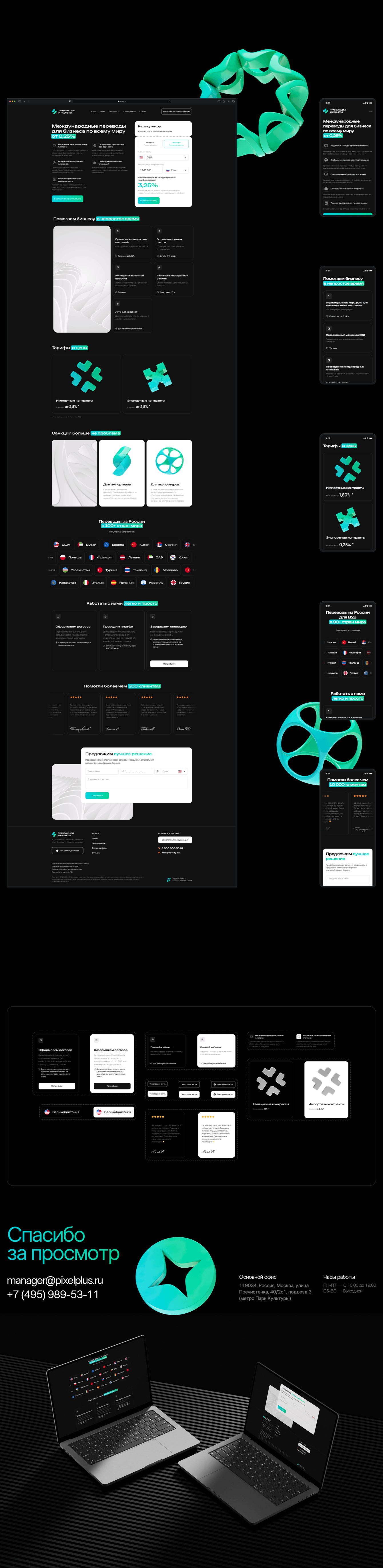 Структура: главная страница с акцентом на ключевые преимущества, интерактивный калькулятор комиссий, блок тарифов для экспорта/импорта, карта стран с географией присутствия (90+ стран), раздел «Как мы работаем» с пошаговым процессом, блок отзывов клиентов и форма обратной связи.