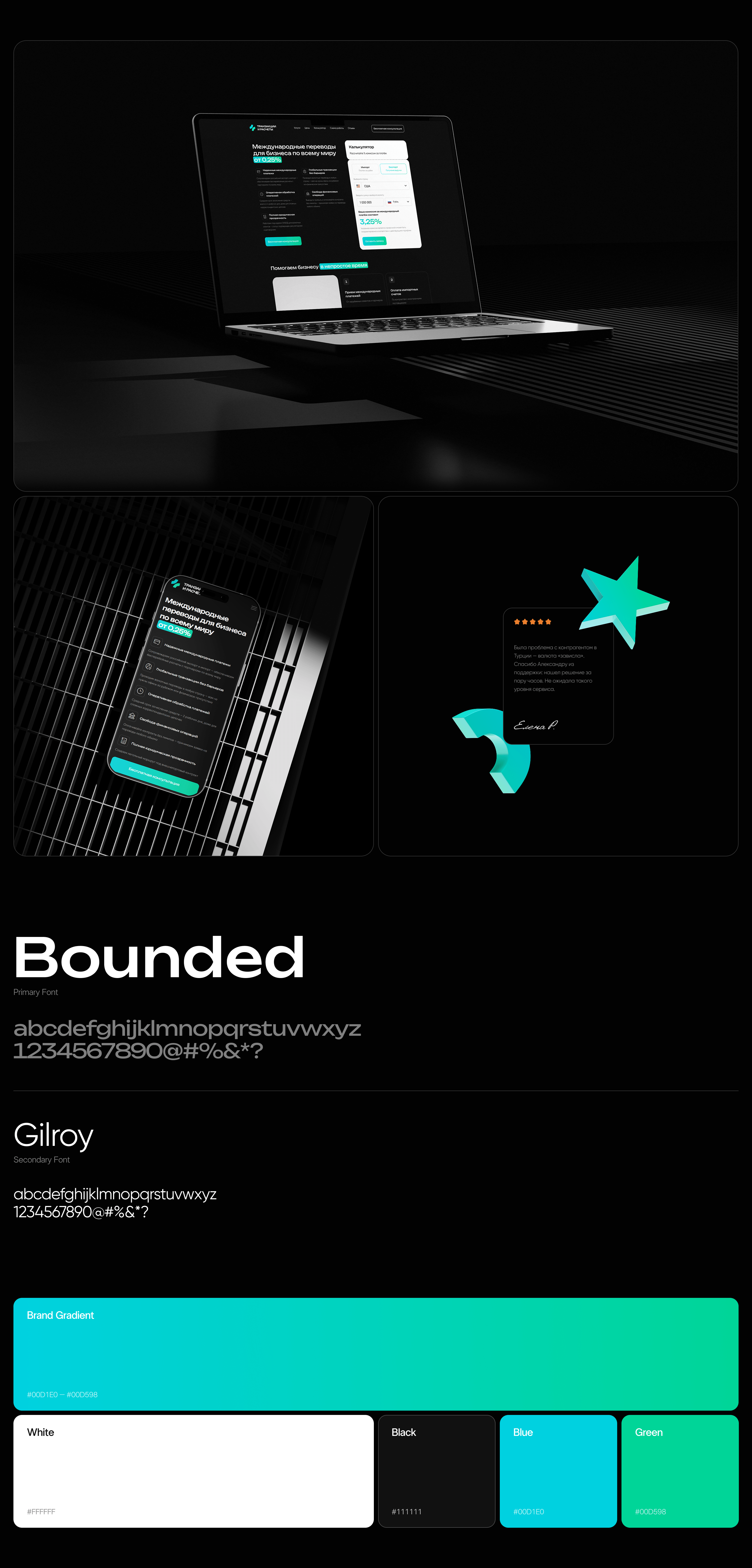 Современный, с акцентом на доверие и профессионализм. Использованы успокаивающие синие тона (ассоциация с финансовой надёжностью), чёткая типографика и визуальные блоки для лёгкого восприятия сложной информации. Минималистичный подход с фокусом на цифры и конкретику: сроки (2 дня), количество стран (90+), объём клиентской базы (10 000+).