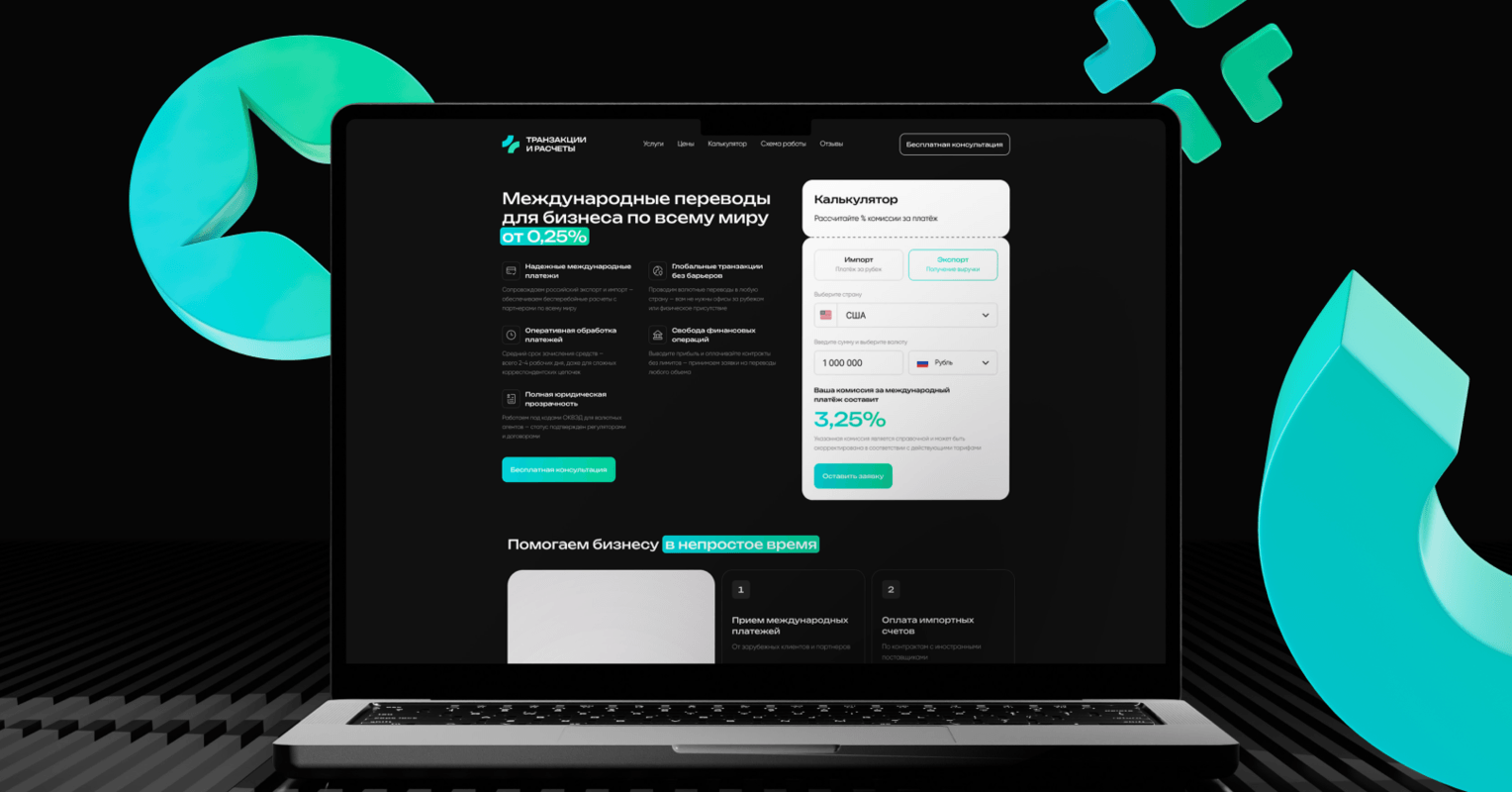 Компания Транзакции и Расчеты, специализирующаяся на международных платежах и сопровождении внешнеторговых операций, обратилась с запросом на создание сайта под ключ. Основные проблемы: Отсутствовала единая платформа для привлечения клиентов — компания работала через личные контакты и рекомендации, не имея онлайн-представительства; Сложность объяснения услуг — специфика международных переводов и комиссий была непонятна потенциальным клиентам без консультации менеджера; Нет автоматизации расчётов — клиенты не могли самостоятельно рассчитать стоимость услуг; Необходимость демонстрации экспертности — нужно было показать географию работы, отзывы реальных клиентов и преимущества в условиях санкций. Цель — запустить современный сайт, который будет привлекать клиентов из B2B-сегмента, демонстрировать услуги понятным языком, автоматически рассчитывать комиссии и собирать заявки.
