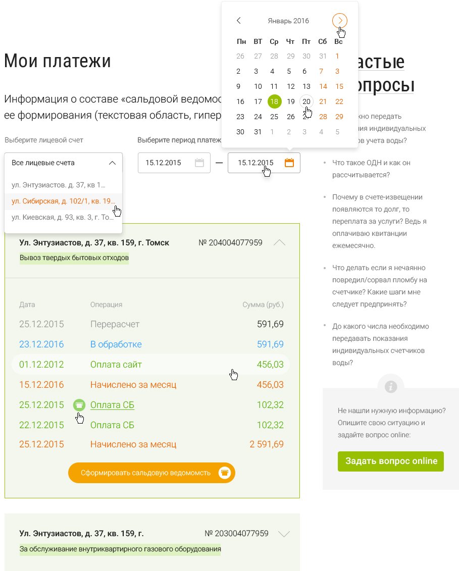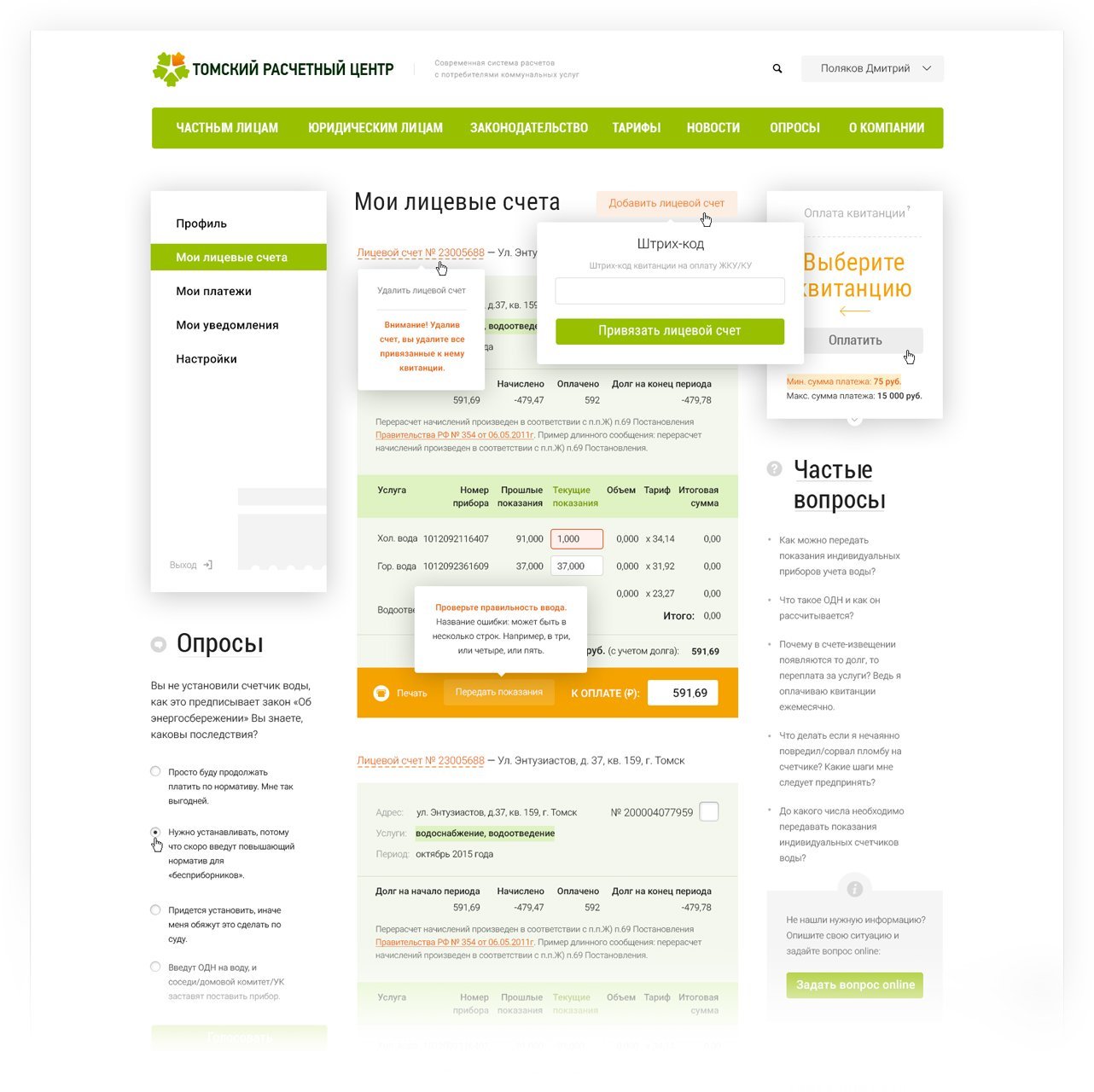 Авторизованный пользователь имеет свой личный кабинет, в котором отображаются лицевые счета, платежи, а также различные уведомления. На странице «Мои лицевые счета» можно создать несколько лицевых счетов, в которых будет видна вся необходимая информация. Мы поработали над различными «подсказками», которые помогают сделать работу на сайте максимально простой и доступной.