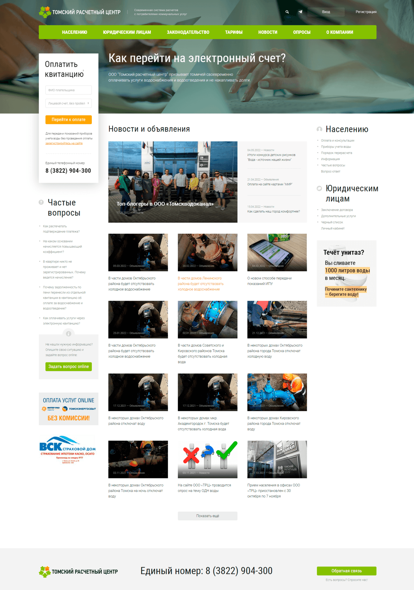После успешной презентации концепции клиенту, отрисовываем Главную. Мы постарались сделать максимально информационную, не перегруженную деталями страницу, оставляя только важное. Авторизация, оплата квитанции, важные и актуальные новости, частые вопросы — всё это без труда можно найти здесь, не переходя в дополнительное меню и не блуждая по страницам: