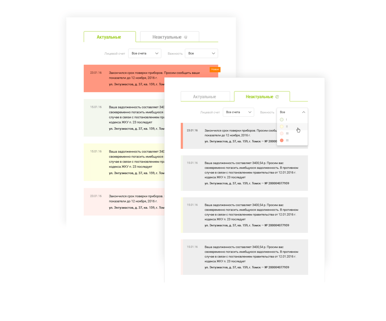 С помощью табов можно выбирать актуальность, а удобный фильтр позволяет выбирать необходимый счет и сортировать по важности.