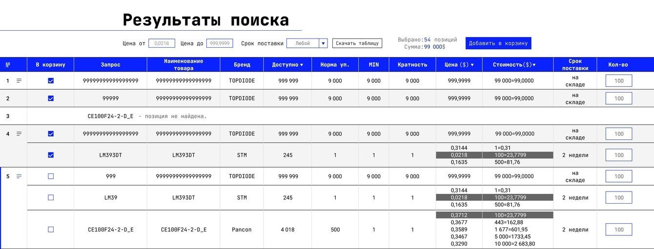 Разработать автоматизированную платформу поиска и закупки электронных компонентов, на которой можно ознакомиться с данными о наличии, цене и сроках поставки, а также оформить заказ онлайн.