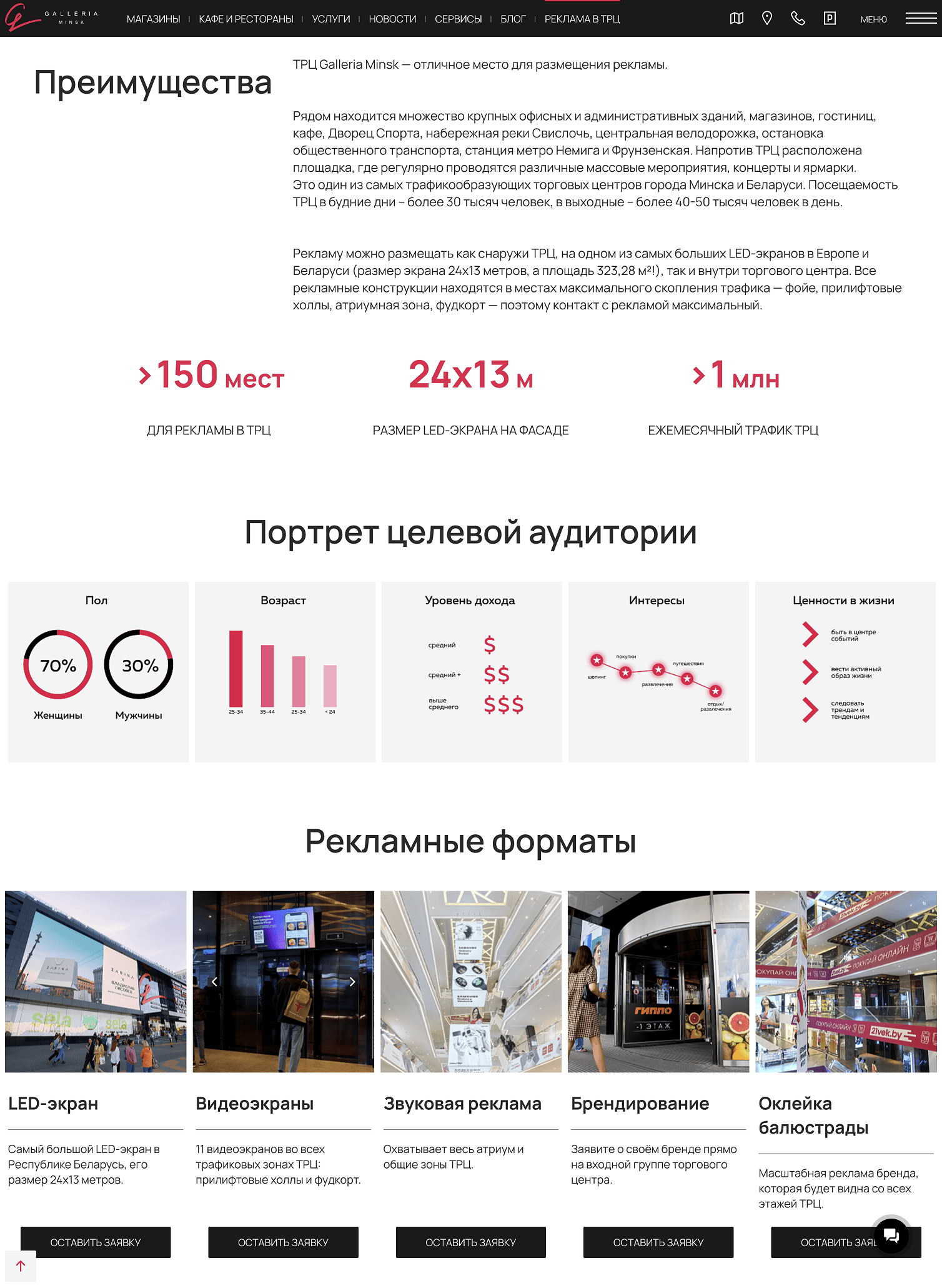 Также мы создали отдельную страницу для рекламодателей. Здесь размещены преимущества ТРЦ в цифрах — количество посетителей, размеры экрана, число рекламных мест. Также дана информация о целевой аудитории и преимуществах расположения.