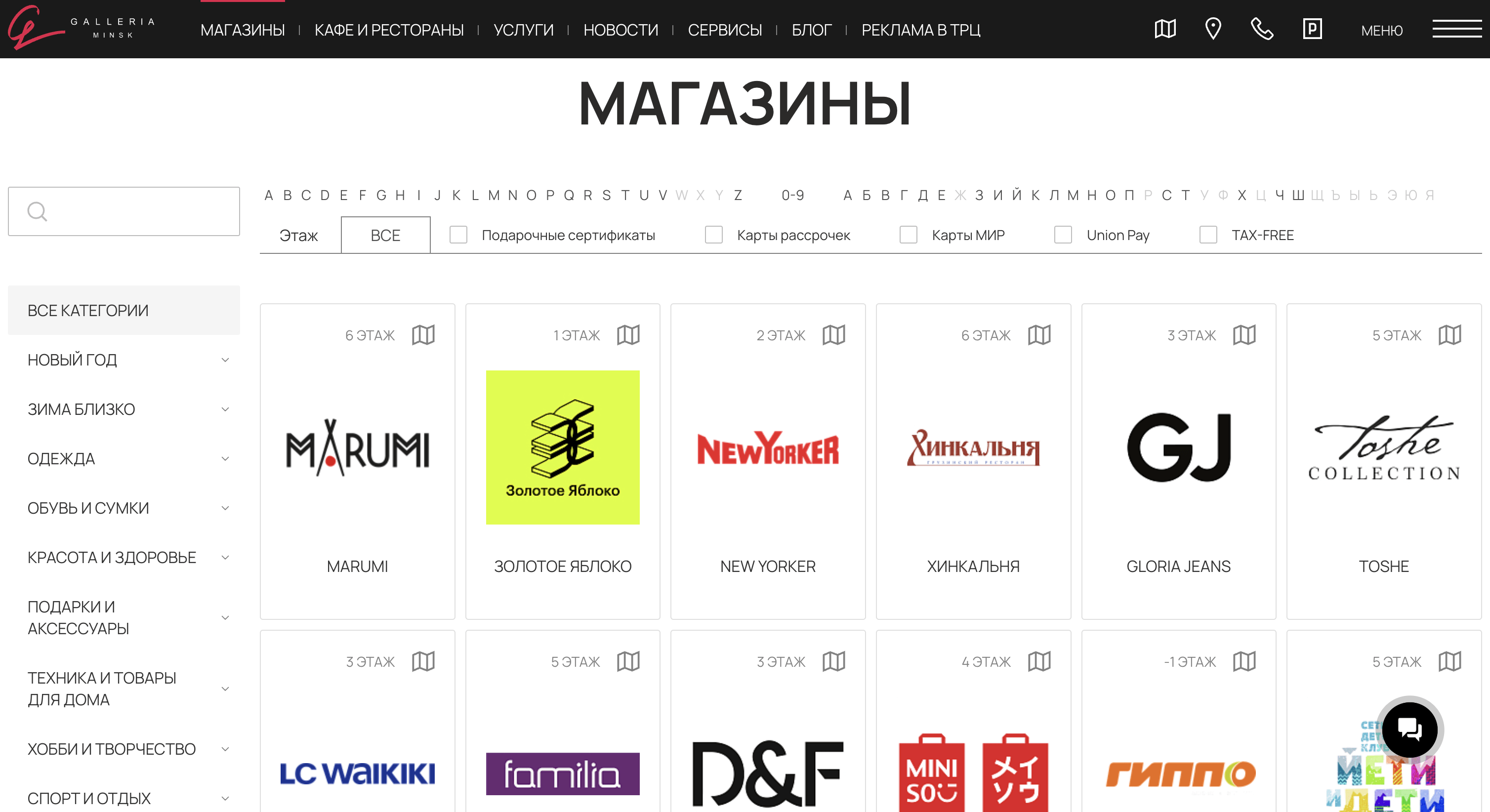 Простой поиск нужных магазинов организовали через каталог. В нем пользователь может отсортировать по первой букве названия и выставить фильтры по категориям товаров, этажу, наличию Tax Free, рассрочек, оплаты картой «МИР» и UnionPay.
