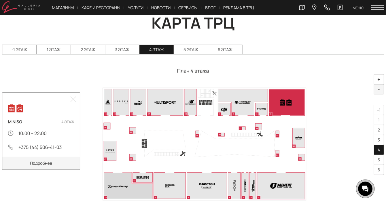 Особенностью проекта стала интерактивная карта ТРЦ. Перед посещением торгового центра пользователь может спланировать свой визит: изучить этажи и отметить для себя расположение нужных магазинов. По клику на магазин открывается поп-ап с краткой информацией, а при нажатии на кнопку «Подробнее» пользователь попадает в карточку магазина с более развернутыми данными.