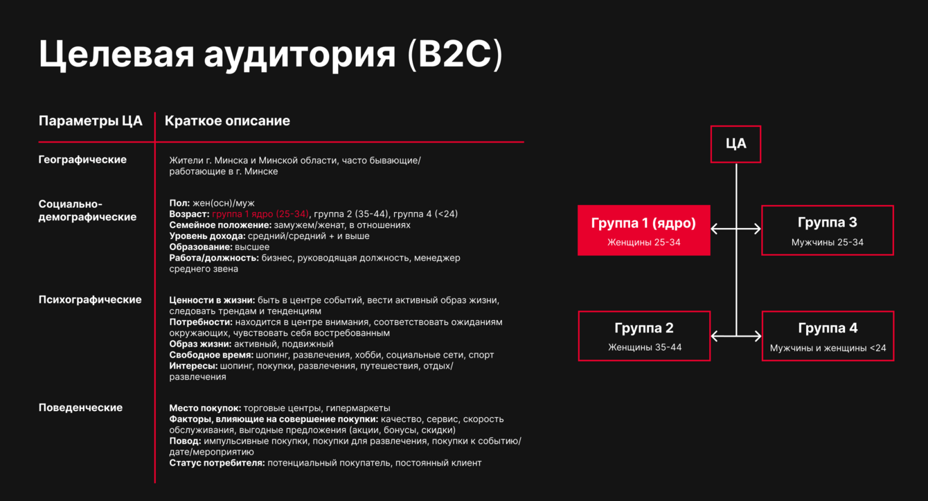 В качестве основной B2C-аудитории мы выделили женщин-покупательниц 25-35 лет с такими интересами, как шопинг, еда, ЗОЖ, красота, мода и искусство. Они ведут активный образ жизни, любят быть в центре событий и часто покупают импульсивно, ориентируясь на выгодные предложения. При покупке они обращают внимание на качество товара, сервис и скорость обслуживания.