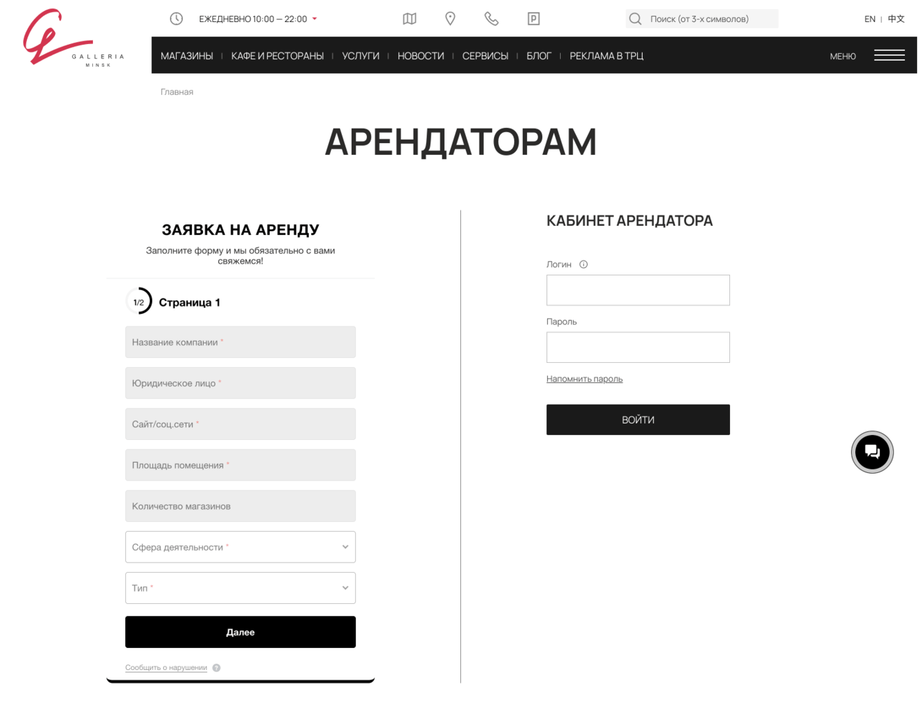 Для второй целевой аудитории ТРЦ — арендаторов, предусмотрена отдельная страница. Там потенциальные партнеры торгового центра могут связаться с менеджером по поводу аренды через форму обратной связи, а текущие — зайти в личный кабинет для управления своим бизнесом.