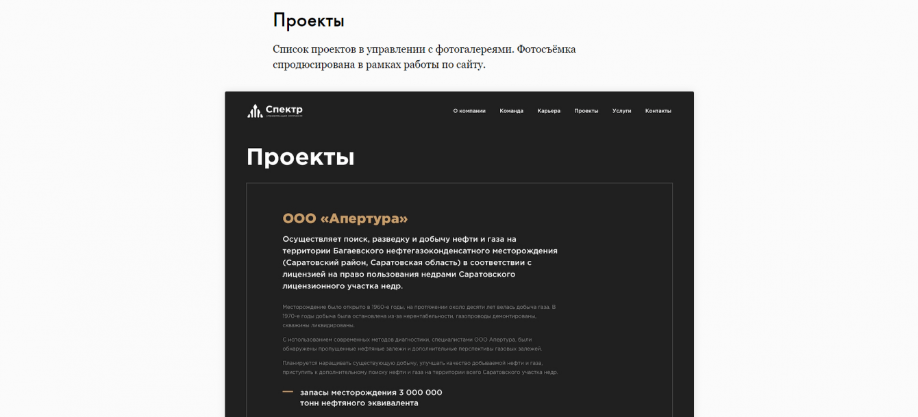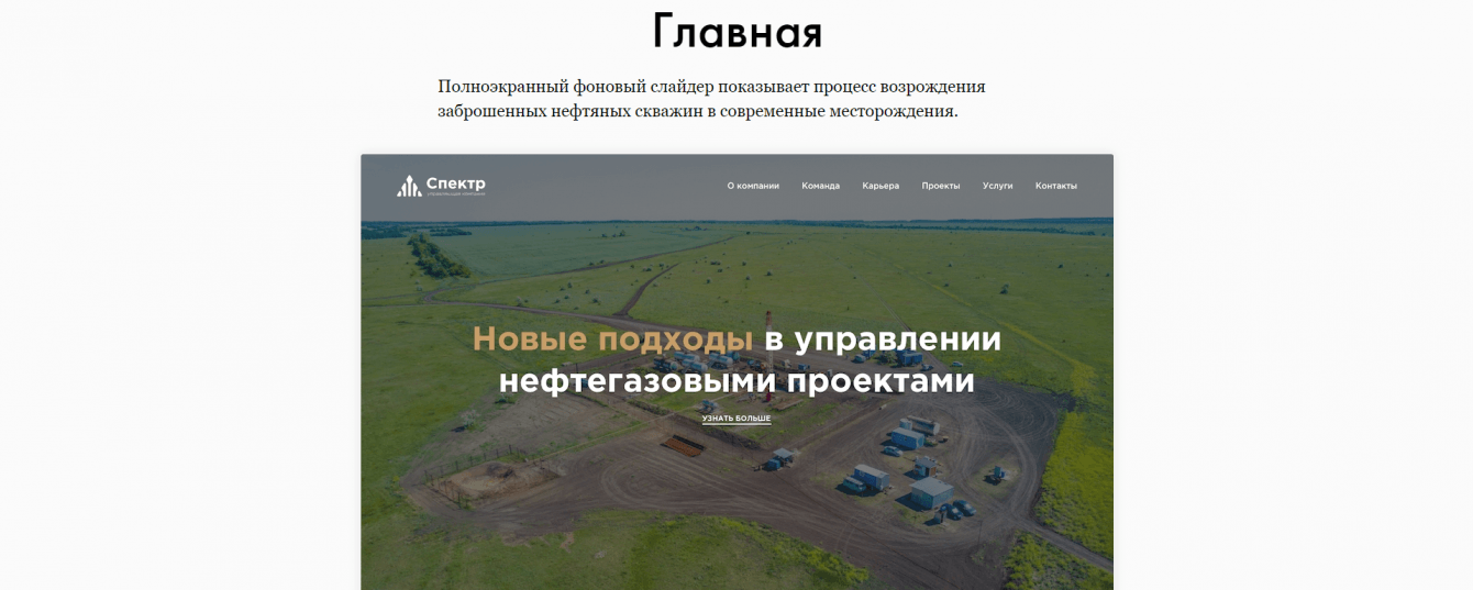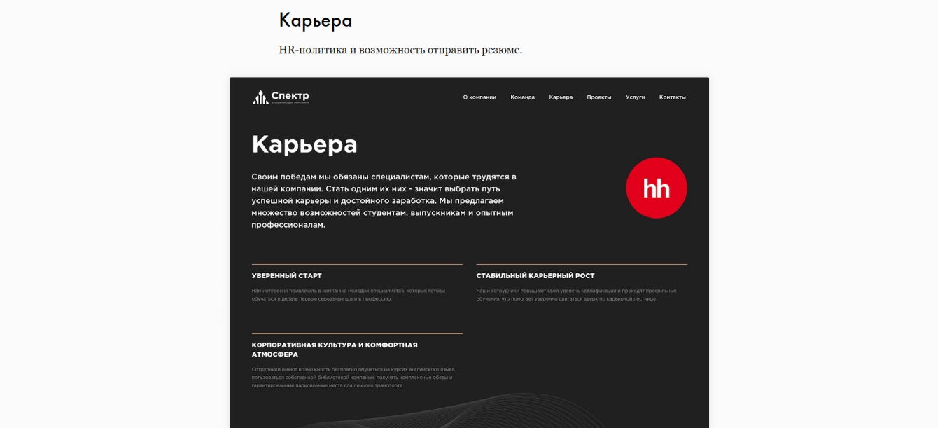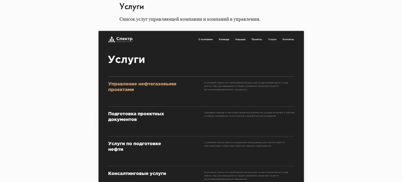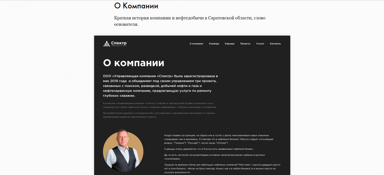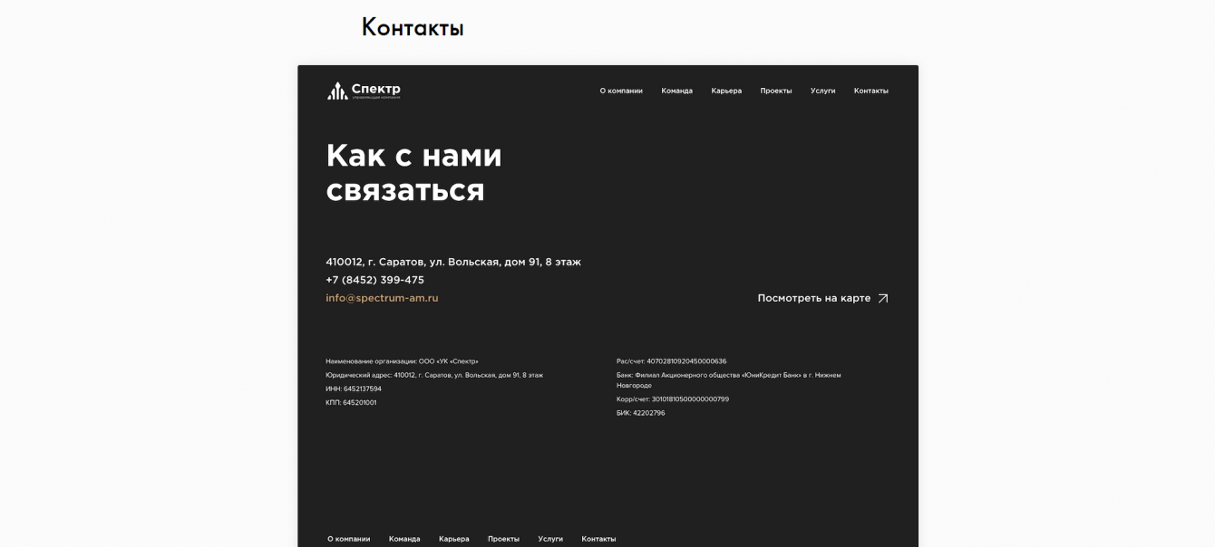 Был разработан корпоративный сайт, на котором показаны достижения УК «Спектр», размещена информация о работе и команде, а также есть история и контактные данные.