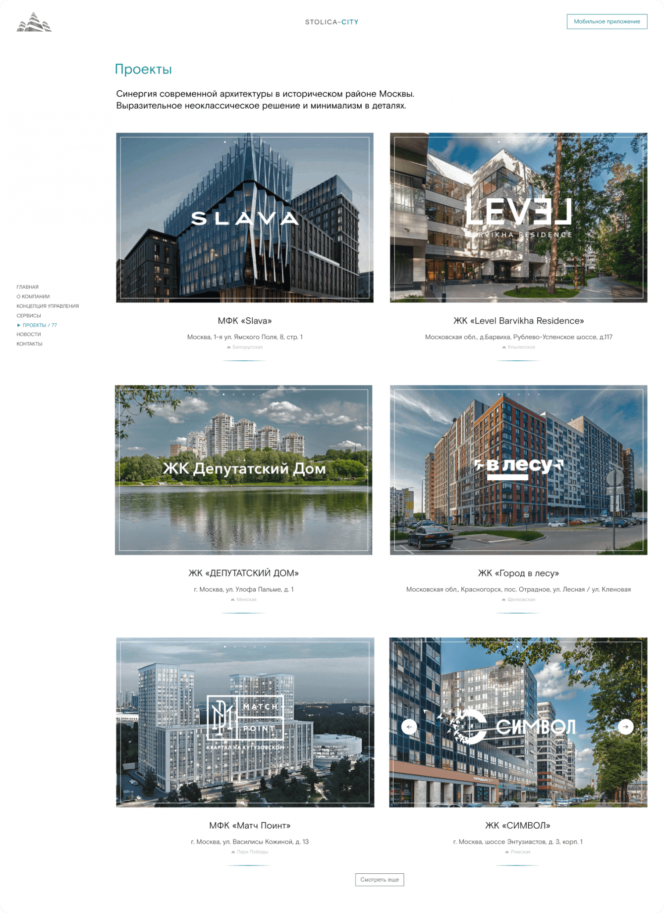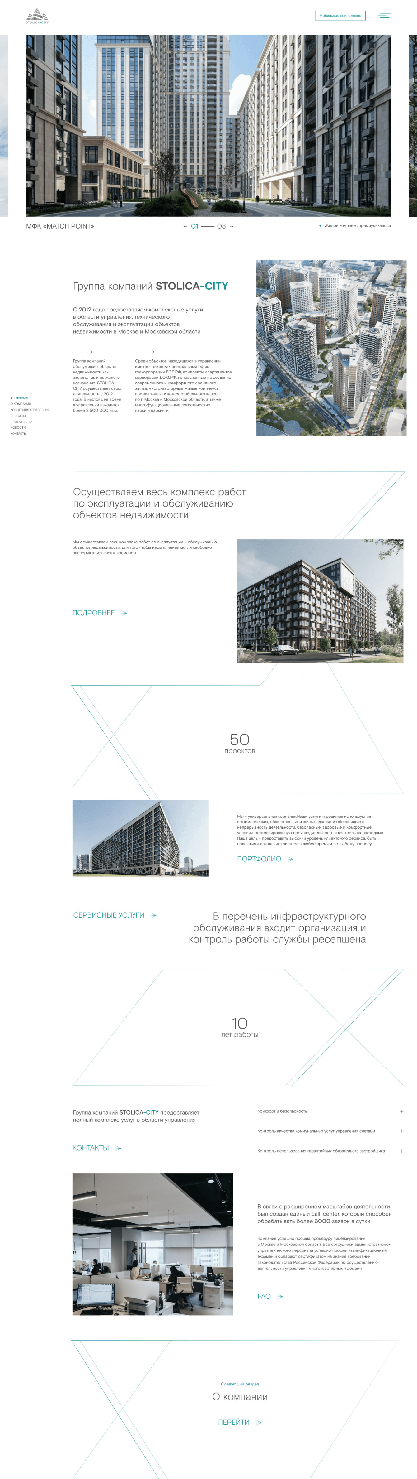 Управляющая компания «СТОЛИЦА» поставила перед нами задачу создать сайт для поиска новых клиентов в своей нише. Главное требование: минималистичность и ясность структуры, в которую важно интегрировать проекты, ресурсы, потенциал и выделить конкурентные преимущества компании.