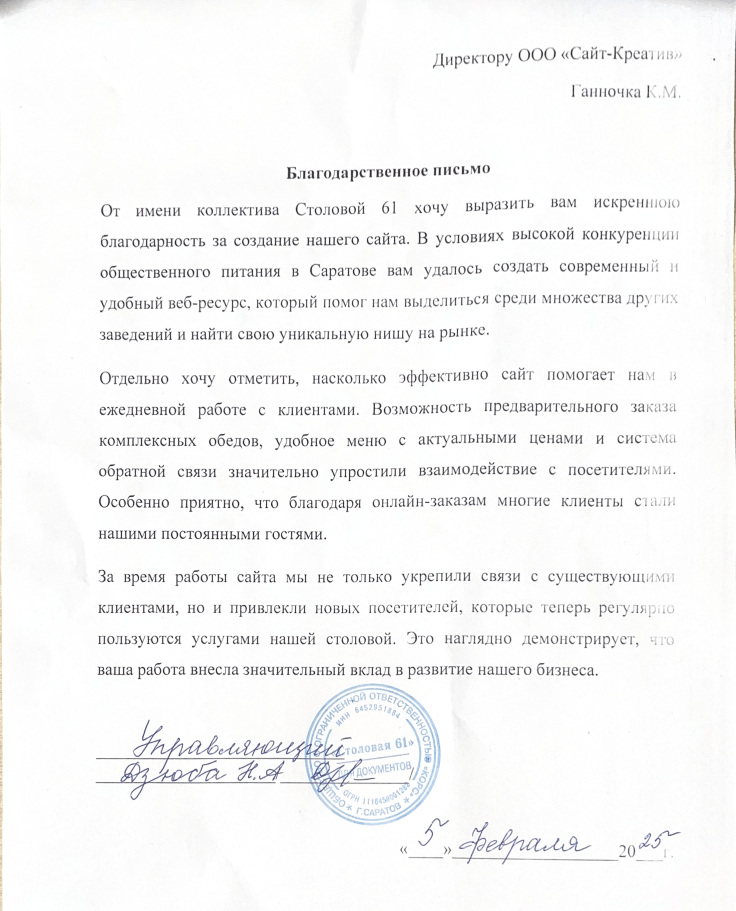 От имени коллектива Столовой 61 хочу выразить вам искреннюю благодарность за создание нашего сайта. В условиях высокой конкуренции общественного питания в Саратове вам удалось создать современный и удобный веб-ресурс, который помог нам выделиться среди множества других заведений и найти свою уникальную нишу на рынке.