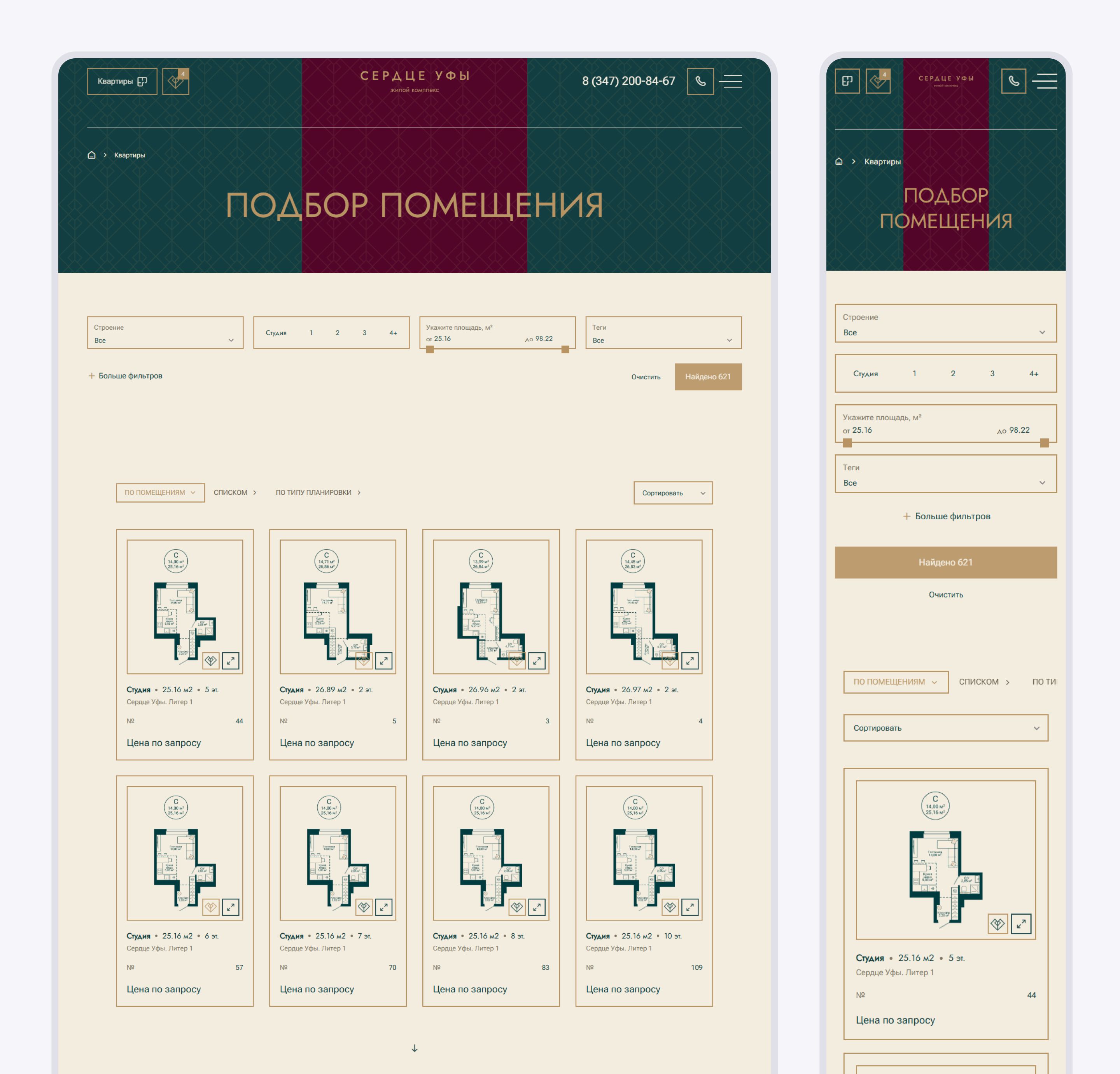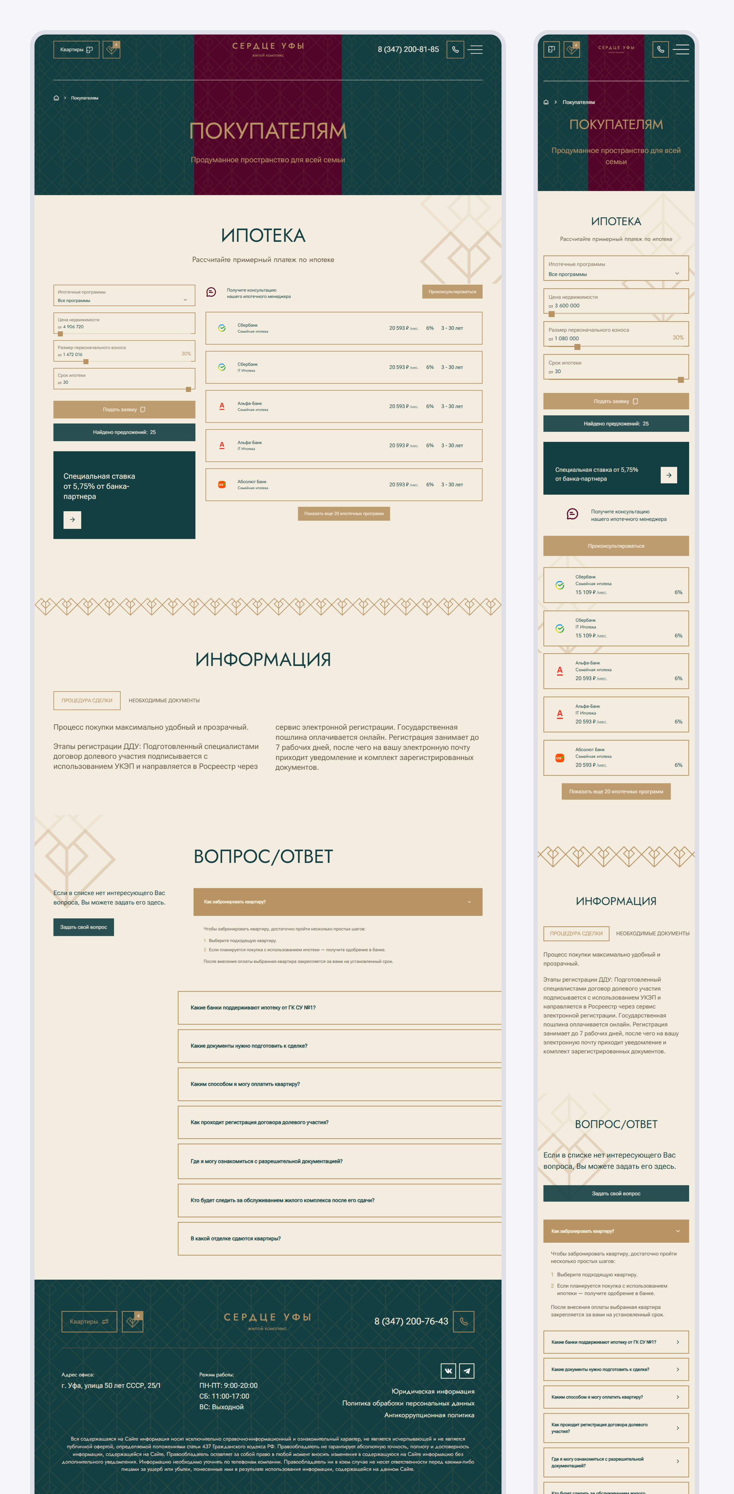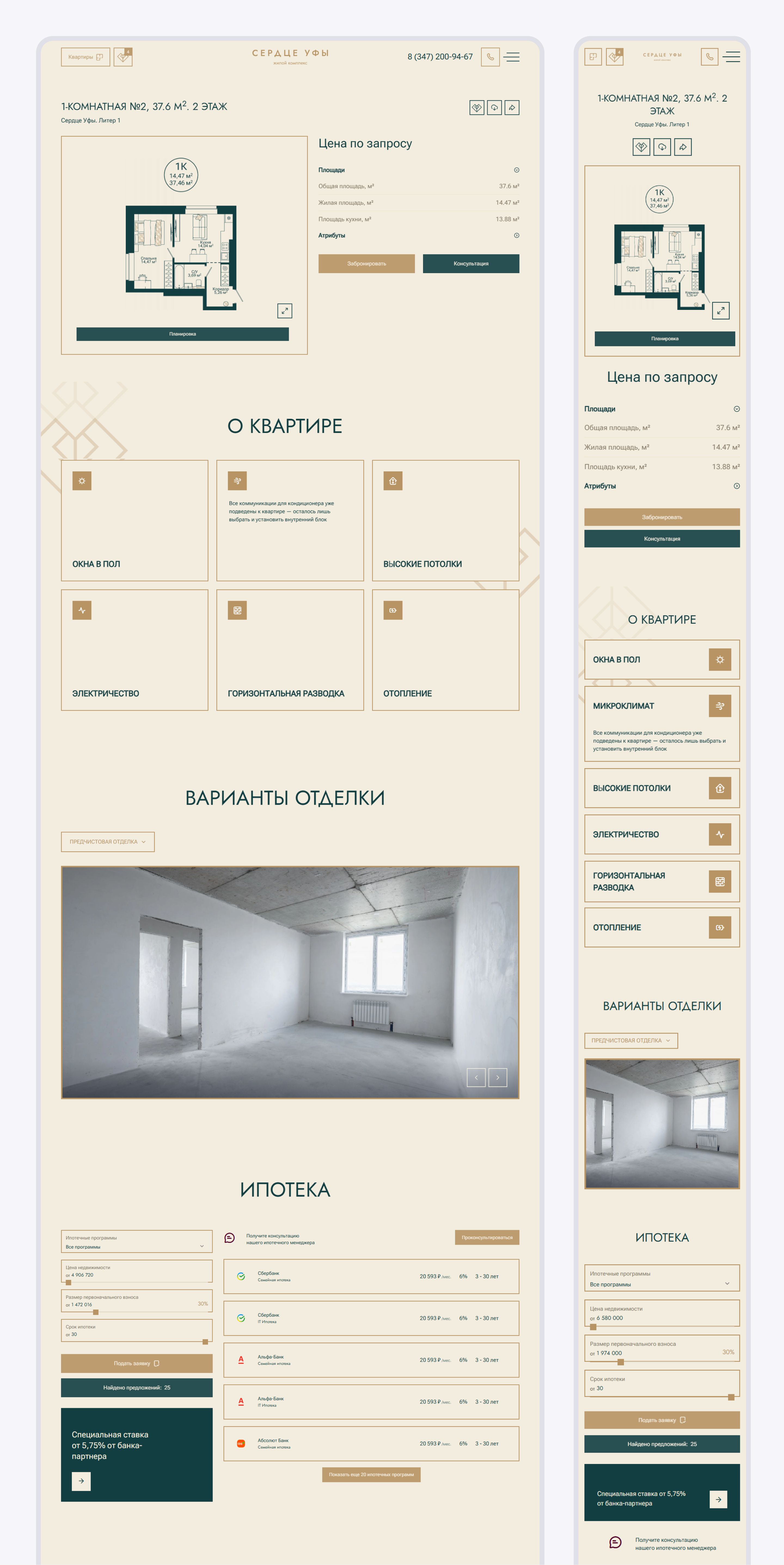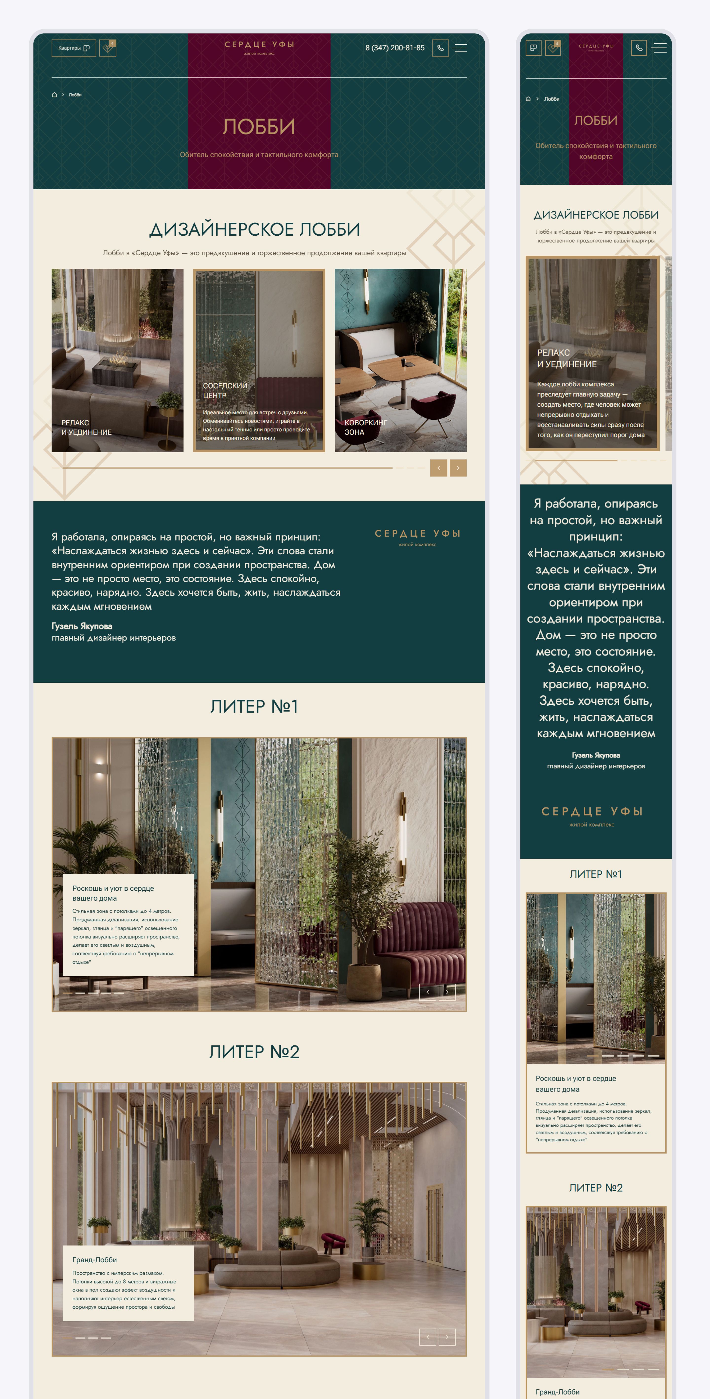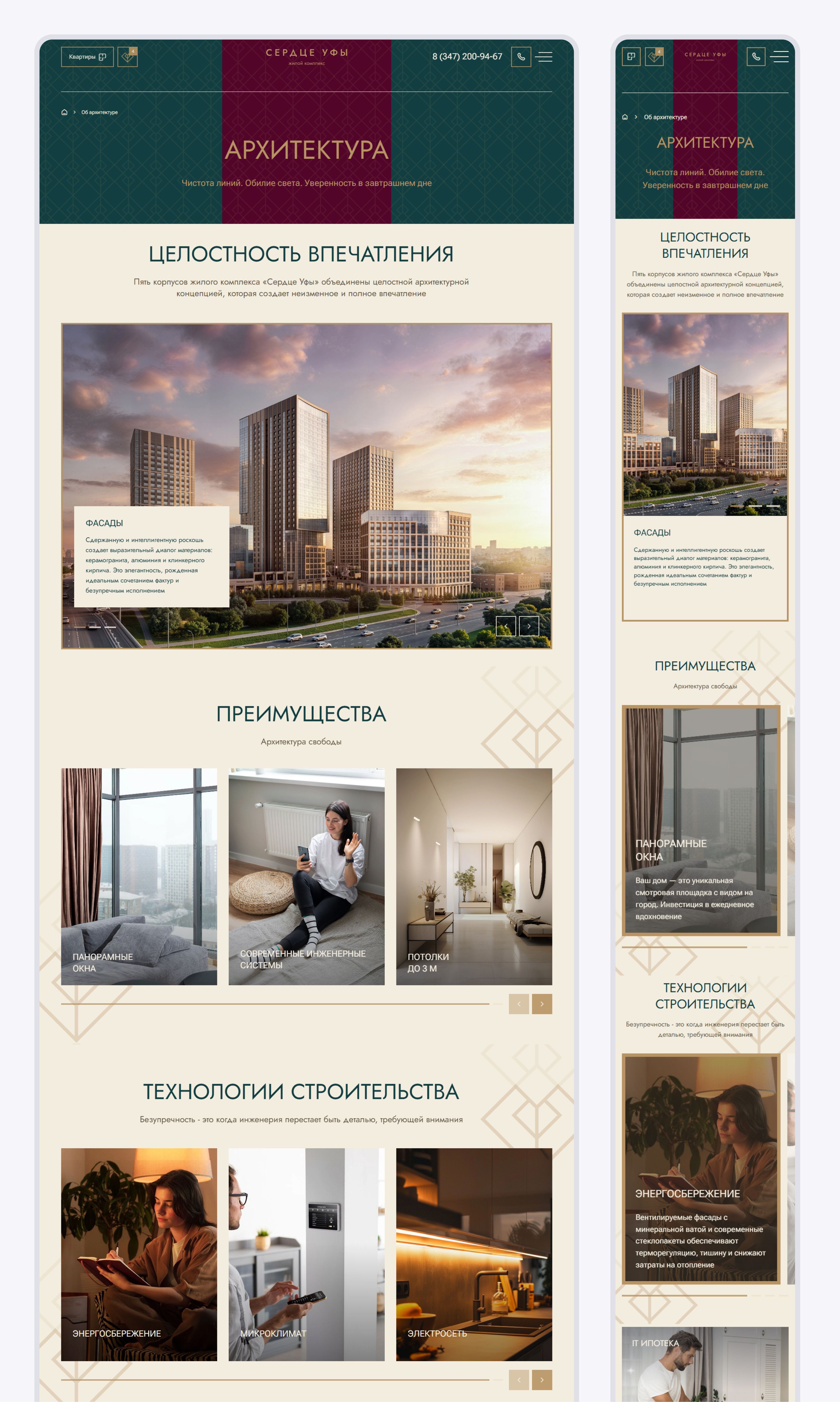 Мы реализовали сайт в премиальной «буклетной» эстетике с использованием тёплой бежево-золотой палитры и тёмно-зелёных акцентов, крупной типографики и полноэкранных рендеров, создающих ощущение пространства и статуса. Сквозным визуальным элементом стал брендированный символ сердца, интегрированный в паттерны, иконки и декоративные детали, что позволило объединить все разделы сайта в единую визуальную историю.