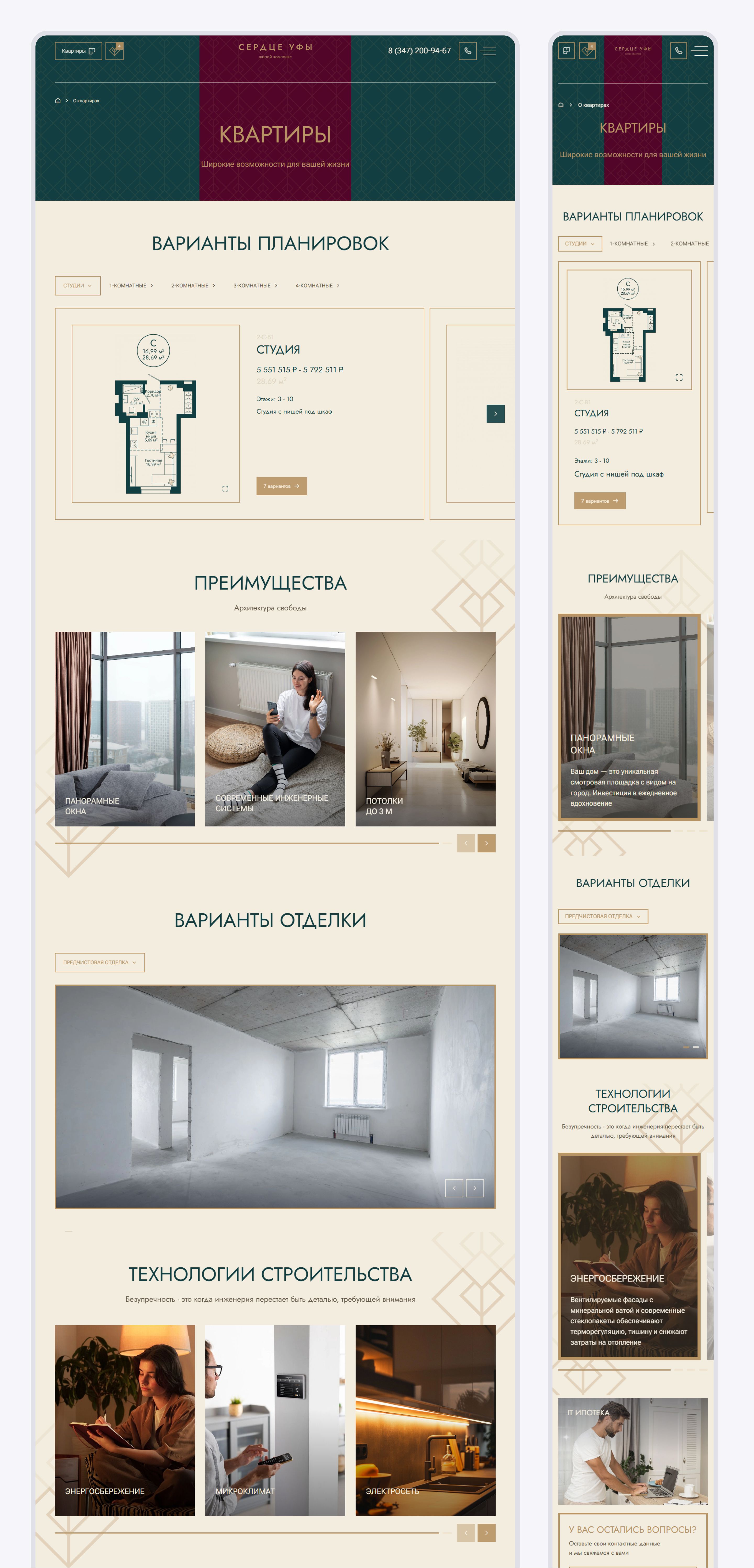 Страница посвящена квартирам проекта. В первом экране расположен функциональный блок выбора планировок: он помогает быстро найти интересующий вариант и посмотреть эту же планировку на другом этаже или в другой секции. Далее идут блоки с преимуществами квартир и технологиями строительства — они раскрывают ценность квартиры и усиливают аргументы в пользу покупки.