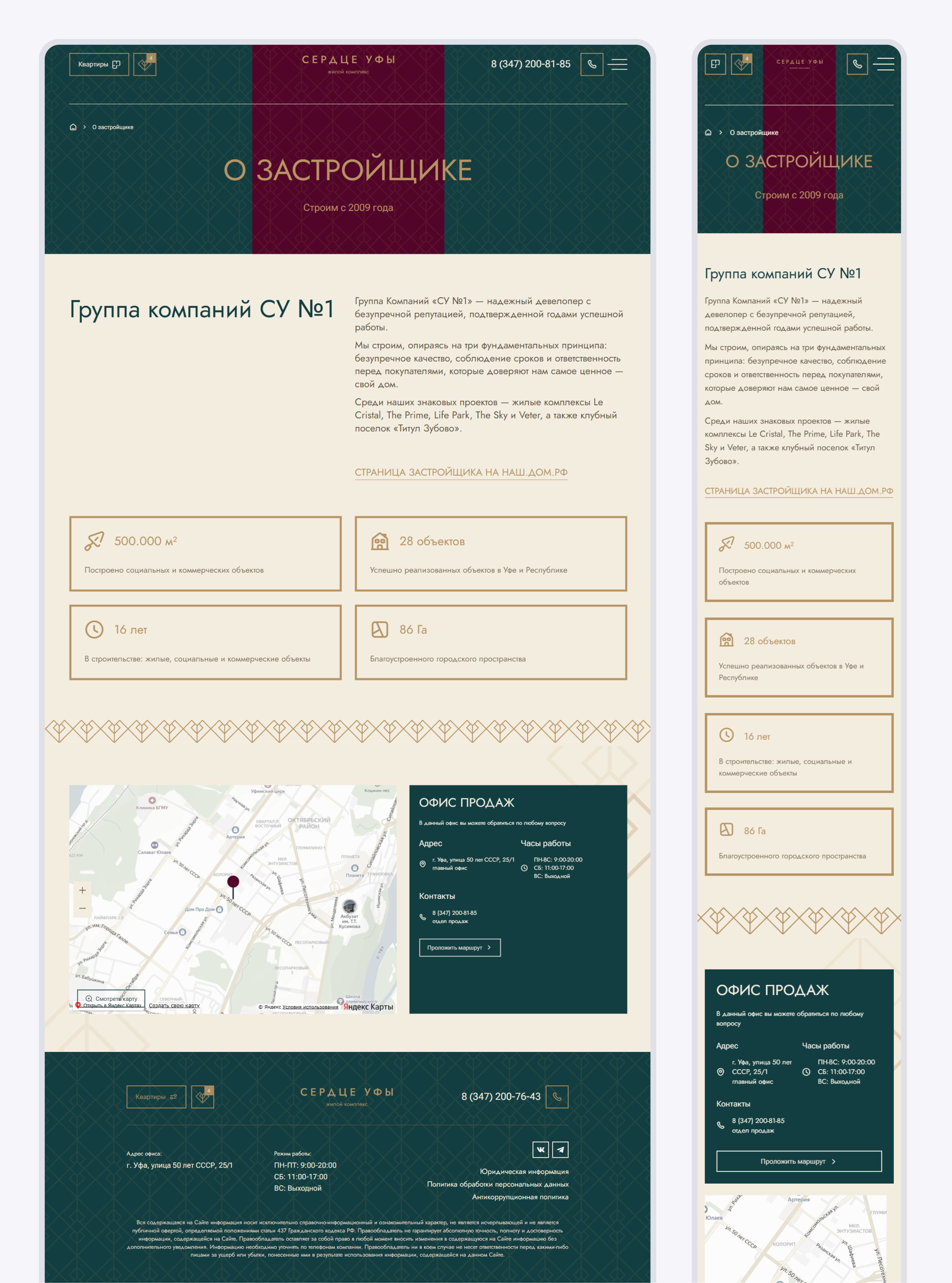 Блок рассказывает о застройщике и его деятельности, а ключевые достижения вынесены в плашки-инфографику. Для удобства предусмотрена кнопка-ссылка на проектную декларацию. Дизайнерский разделитель с фирменным паттерном сердца структурирует страницу: он балансирует текстовые секции и визуально отделяет их от блока контактов.
