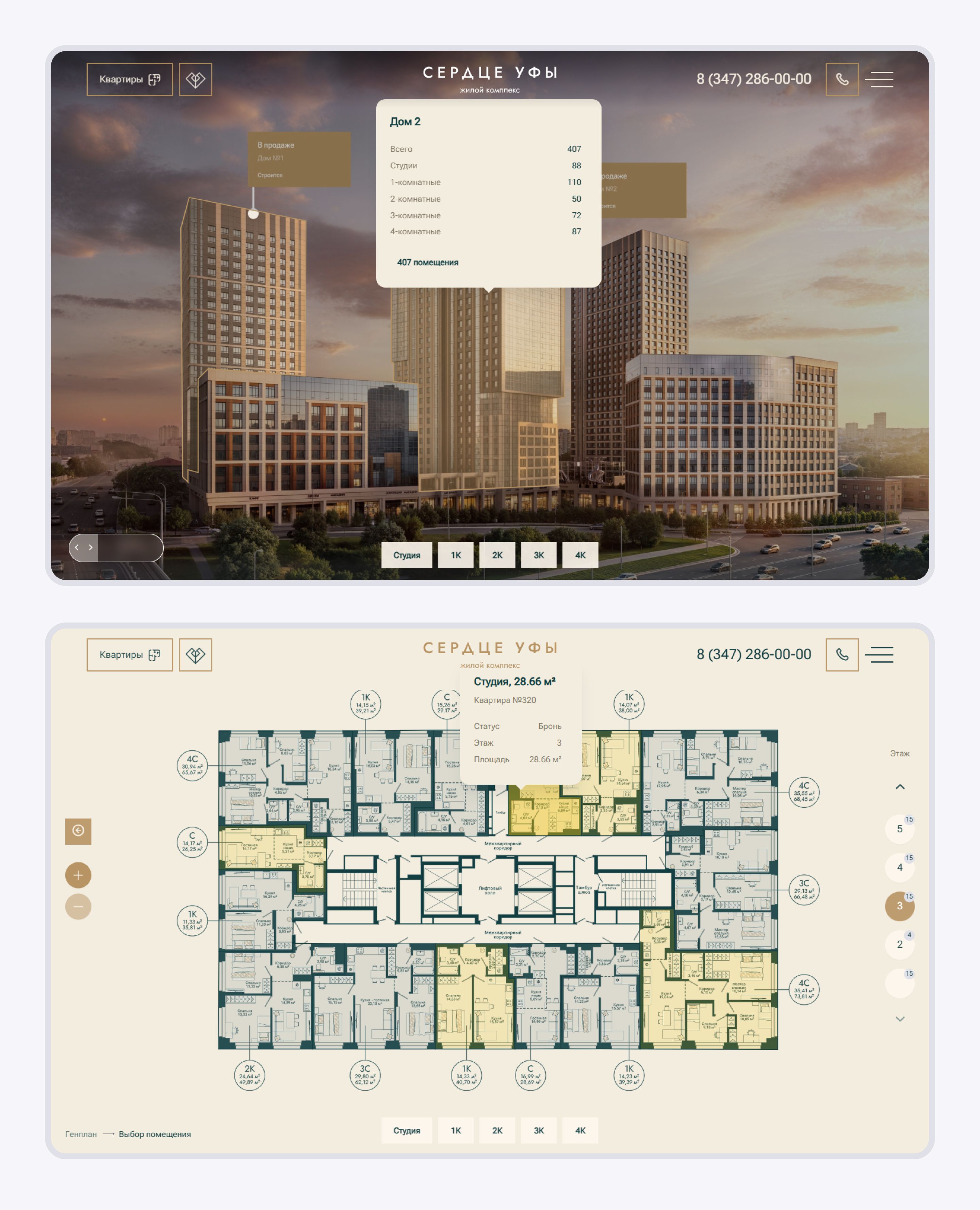Визуальный выбор квартир реализован через интерактивный генплан: пользователь выбирает дом и сразу оценивает его расположение. При наведении открывается всплывающая карточка с ключевой информацией — доступные типы планировок и количество квартир. Далее можно перейти к поэтажному плану: все квартиры размечены, а клик по выбранной квартире ведёт на её детальную страницу.