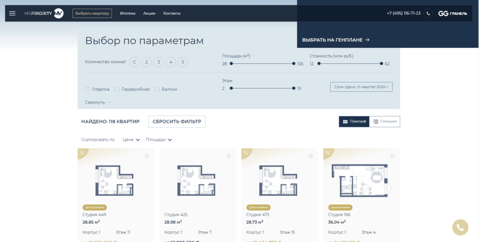 Сделали его максимально информативным, чтобы пользователи легко ориентировались в ценах, могли «прогуляться» по интерактивным картам, посмотреть live-трансляцию строительства, детально изучить планировку квартир, оценить вид из окна.