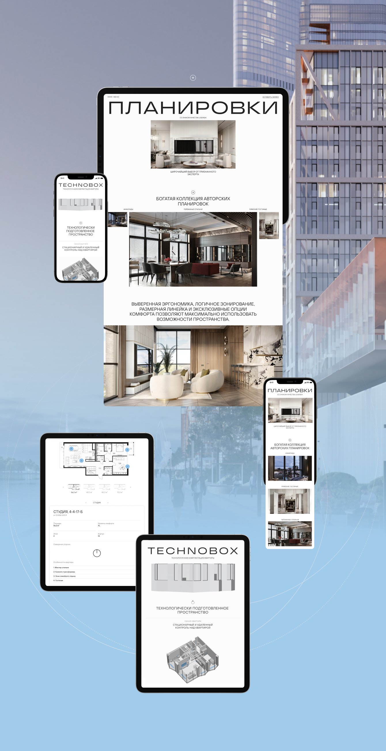 — Реализовали анимационные эффекты и интерактивные элементы: 3D-модели TechnoBox и селекции планировок.
