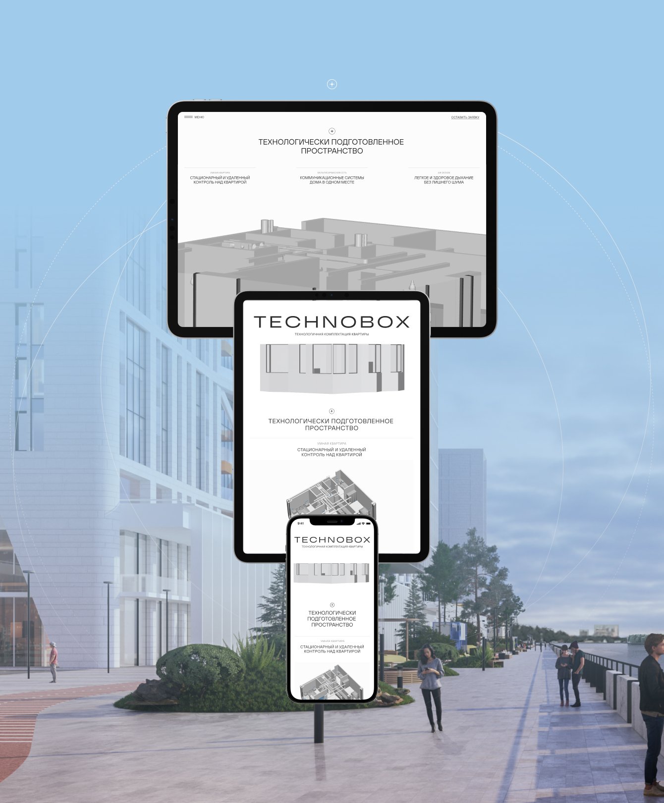 Дизайн сайта выполнили с учётом брендбука застройщика и так, чтобы он передавал премиальность проекта. Подобрали стильные, профессиональные фотографии интерьеров. Реализовали плавные анимации скролла и интерактивные переходы между экранами. Создали 3D-анимацию, чтобы продемонстрировать TechnoBox — одно из главных преимуществ ЖК, когда вместо стандартной отделки собственник получает пространство, готовое к интеграции умных решений и декорированию.