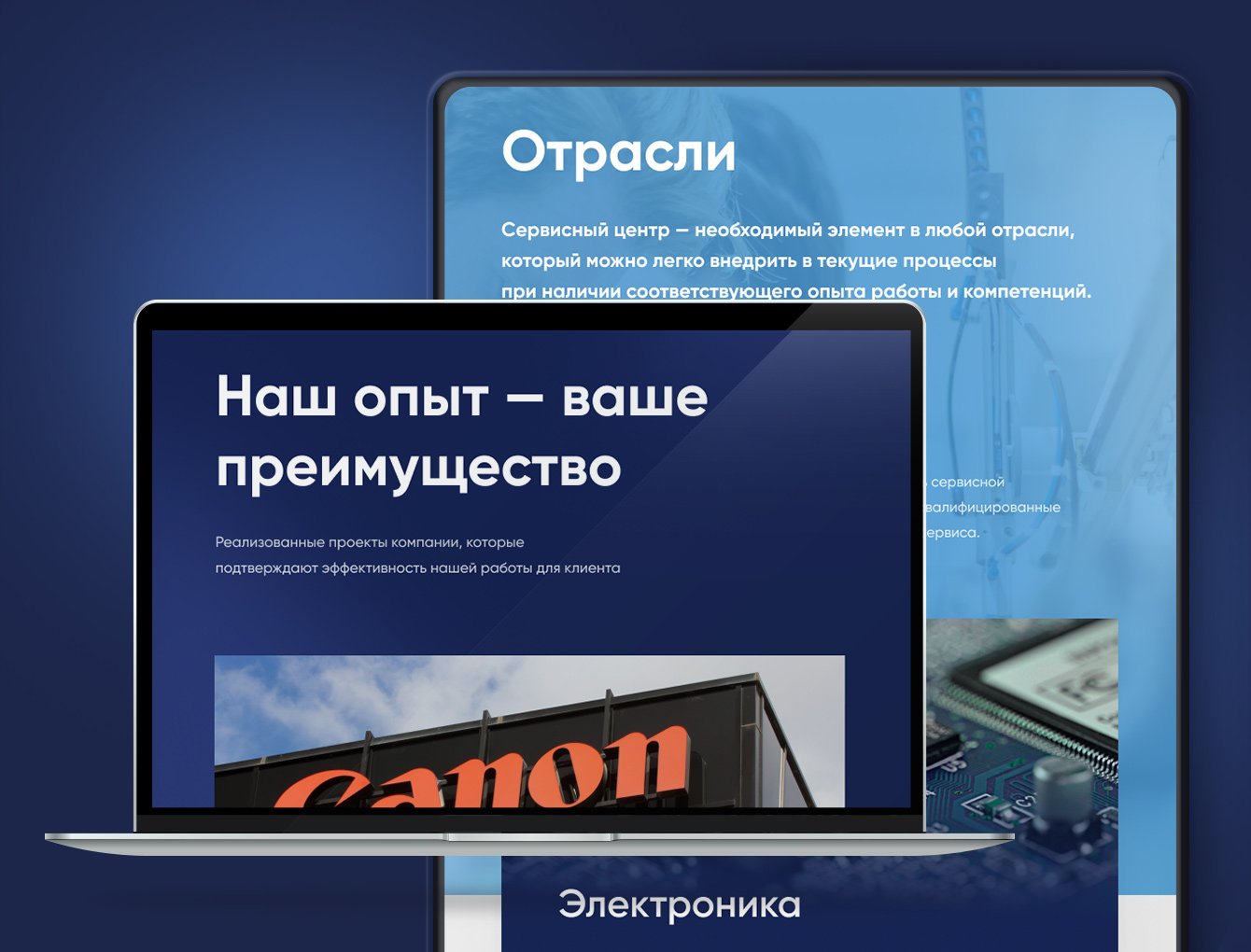 Цветовая палитра была выбрана сбалансированная и спокойная: глубокий темно-синий, белый и небесно-голубой. Эти цвета подчеркивают профессионализм и техническую экспертизу. Акцентный голубой привлекает внимание к ключевым элементам. Лаконичный шрифт без засечек выглядит современно и улучшает читаемость. Верхнее меню сделали с ховер-эффектом, что обеспечивает визуальную динамику, и добавили анимацию в «бургер»-меню. Все эти аспекты делают облик сайта актуальным, технологичным и минималистичным.