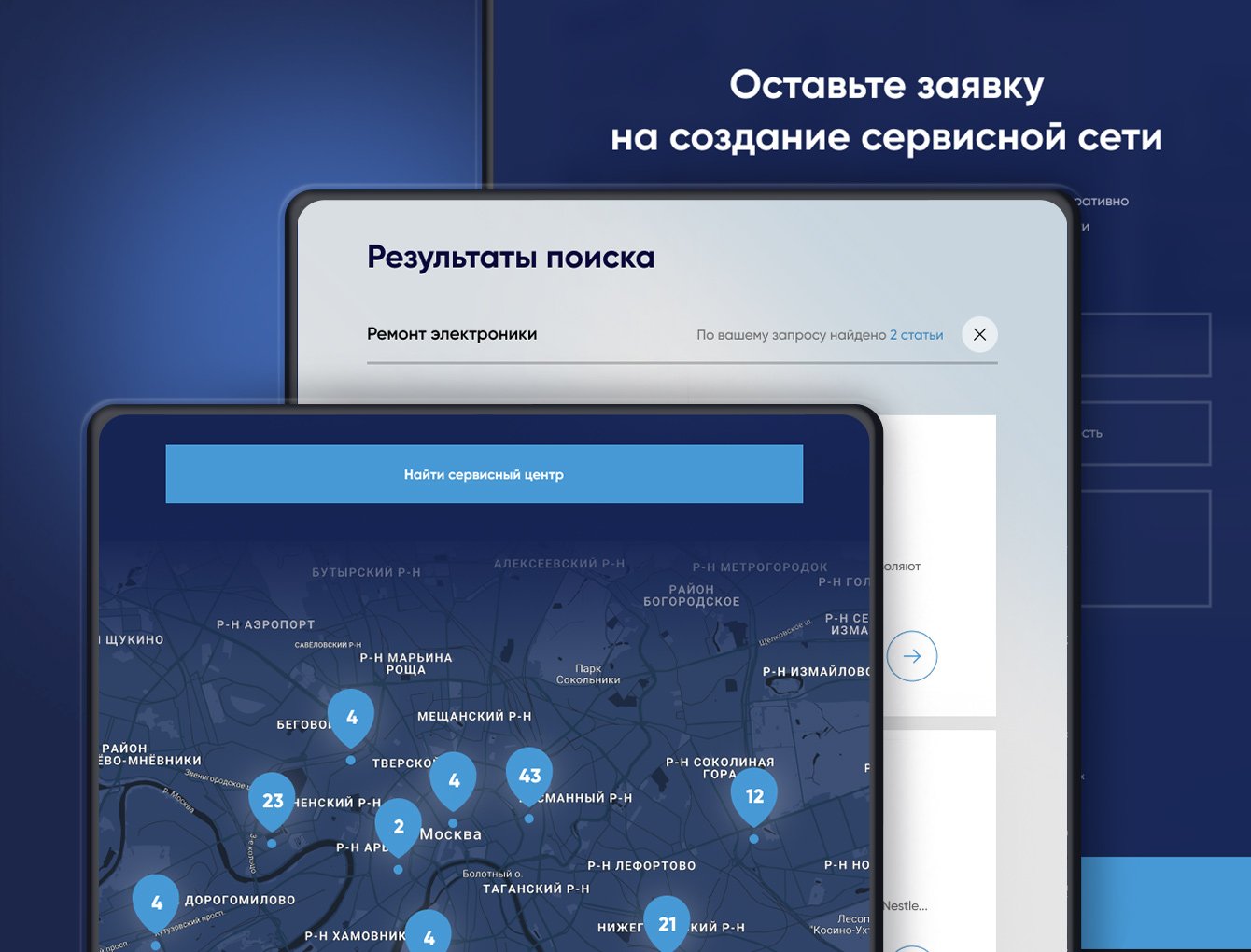 - интегрировали в карту клиента дилеров по всей стране и добавили поиск по сервисным центрам, что не только дает пользователям возможность найти ближайший пункт обслуживания, но и демонстрирует масштаб присутствия клиента на рынке.