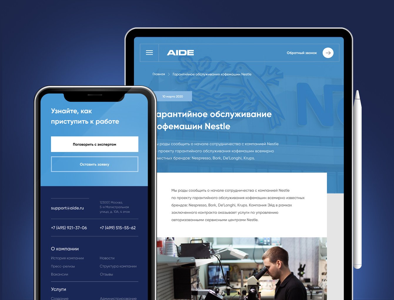 Клиент: AIDE — компания, которая стала настоящим экспертом в области сервисной поддержки. Основная специализация клиента заключается в разработке и внедрении сервисных сетей для производителей и дистрибьюторов электроники и бытовой техники на территории СНГ. За период своего существования AIDE успела посотрудничать с такими крупными компаниями, как Canon, Apple, Fujifilm, разработав и наладив для них эффективные сервисные сети.