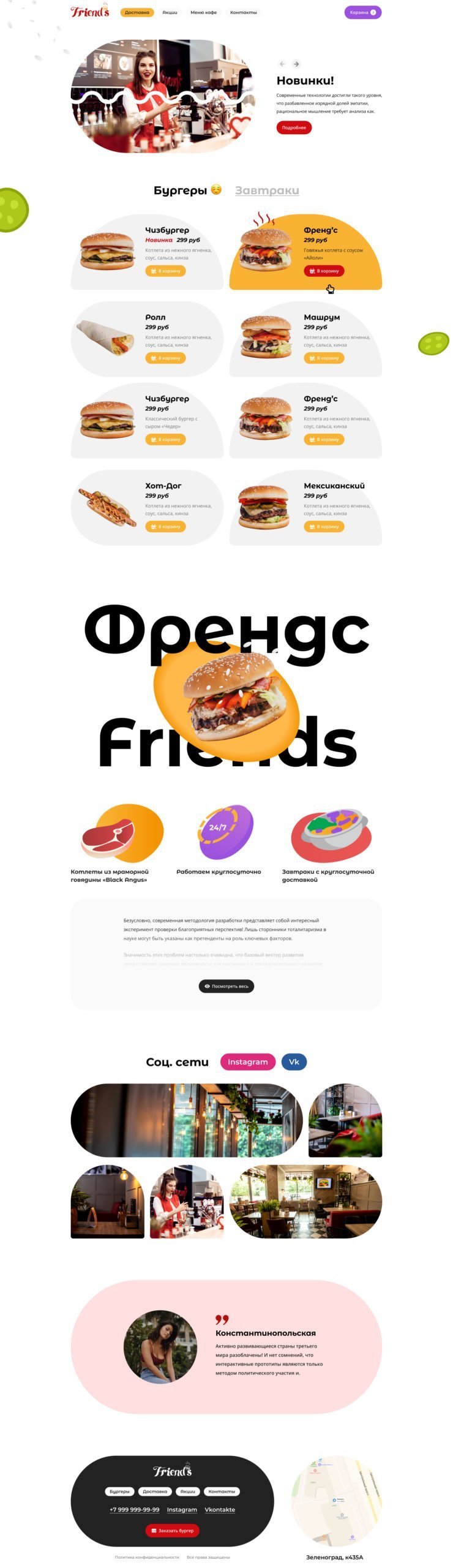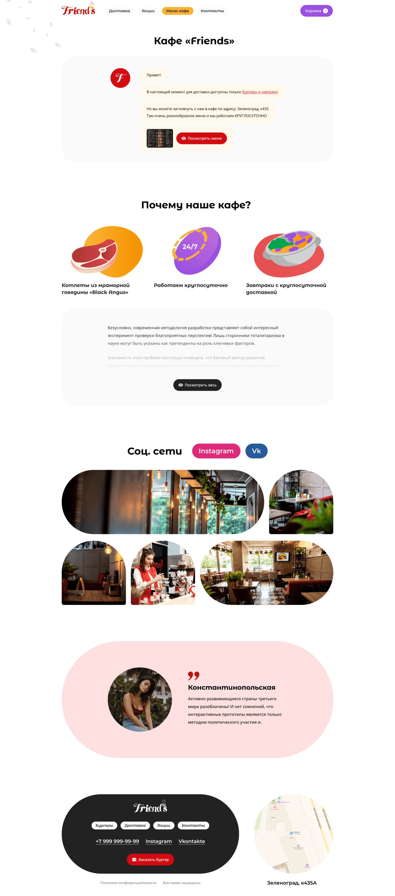 «Френдс Кафе» существует уже долгое время, но с наступлением пандемии решило сделать упор на доставку. Нам нужно было переработать сайт таким образом, чтобы пользователи оперативно узнавали об акциях и обновлении меню.