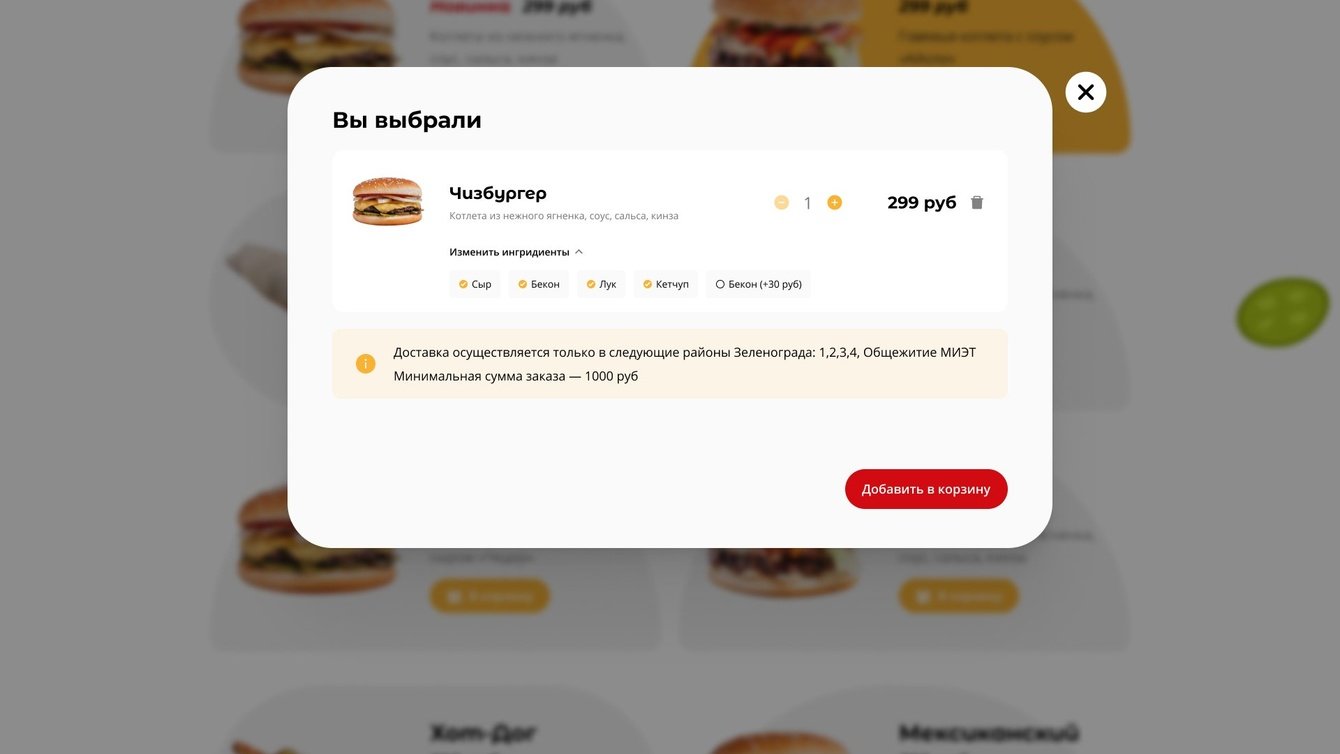 Мы делали основной упор на разработке каталога бургеров. В кафе их покупают чаще остальных блюд, а потому заказчик задумался о доставке.
