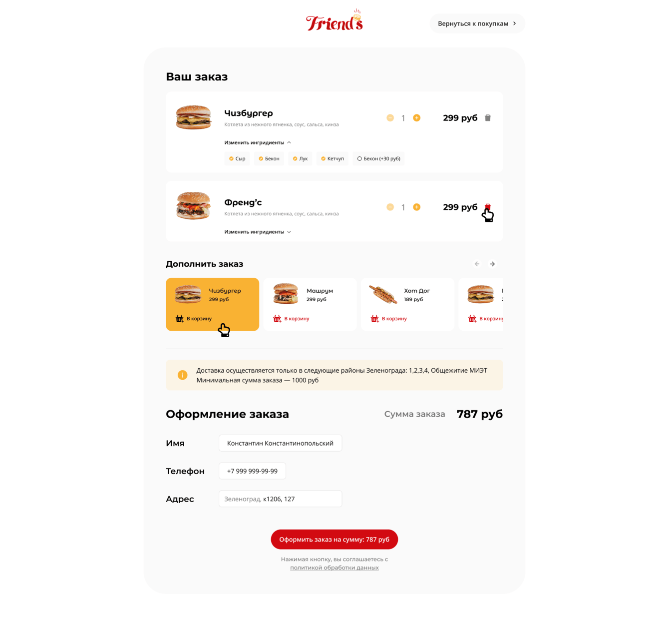 В период первой волны пандемии «Френдс кафе» потребовалась доставка. Клиент не отказывался от работы с агрегаторами, но для усиления продаж нужен был свой проект. Мы предложили заказчику создать удобный и интересный каталог бургеров с удобной системой оформления заказов и онлайн-оплатой.