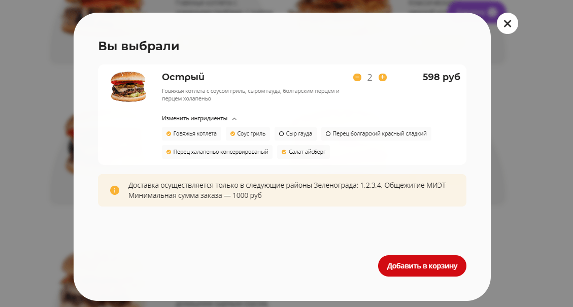 Добавить или убрать ингредиент можно на стадии оформления заказа. Здесь же указаны условия доставки – в какие районы придет еда и какой минимальный ценник.