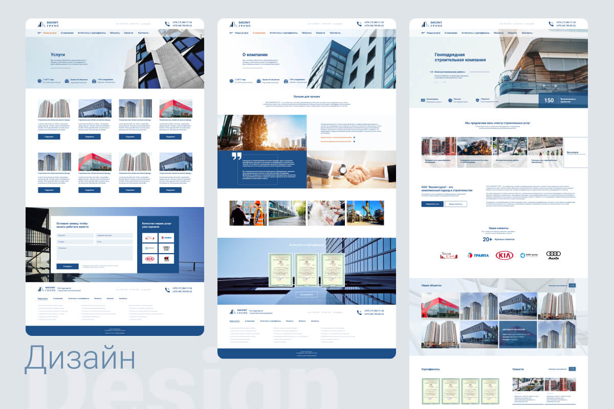 Учитывая пожелания клиента, мы сделали дизайн строгим и без изысков. Для сайта, направленного на иную целевую аудиторию и продающего не столь серьёзные услуги, как “БиолитГрупп”, уместны были бы всплывающие окна и автоматически проигрываемые видео, однако в данном случае мы придерживались концепции минимализма.