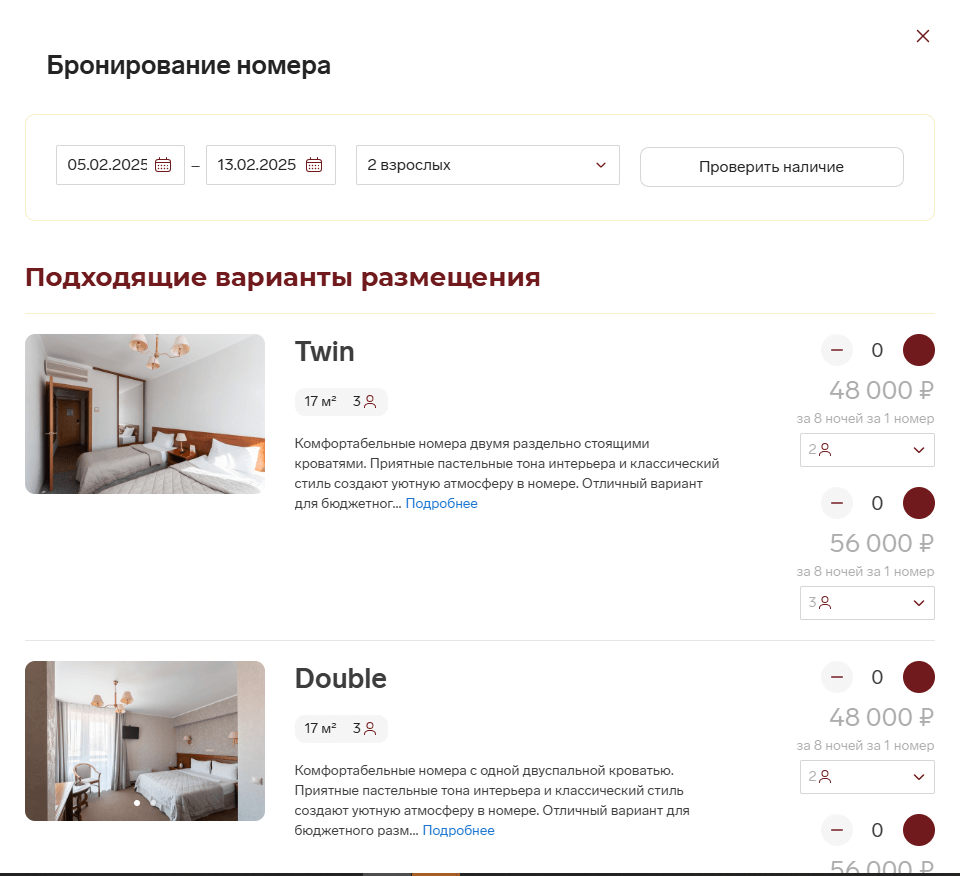 Установили и интегрировали систему "Контур-отель". Теперь гости могут выбрать номер, указать даты, количество человек, добавить дополнительные услуги – всё в пару кликов.