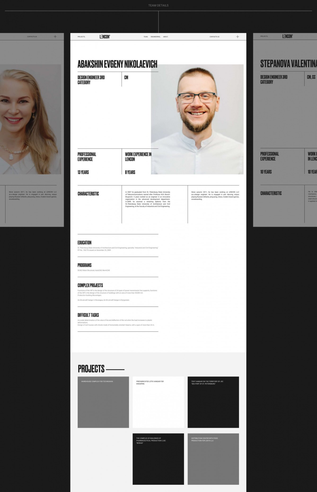 Кроме прочего, мы сделали акцент на команде Lencon — для каждого сотрудника создана детальная страница с описанием его должности и специализации. Там же можно посмотреть, в каких проектах сотрудник принимал участие. А на детальных страницах каждого проекта указаны сотрудники, которые его выполняли. Такая фишка делает проекты более “реальными”, а компанию — “живой”. Заказчик сразу видит, кто и какую работу выполняет в компании и какие результаты приносят эти труды.