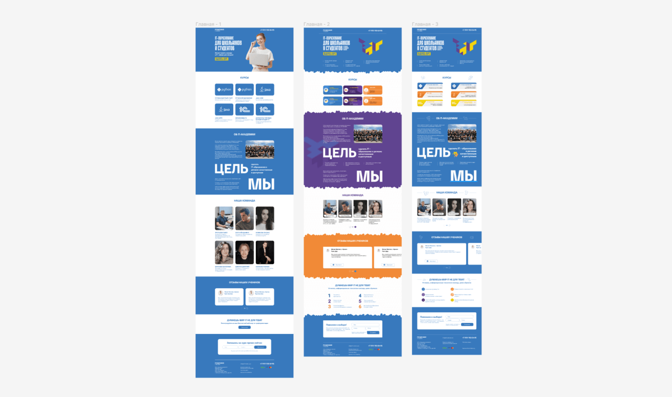 На основе прототипа главной страницы разработали 3 версии концепции дизайна. Были определенные ограничения, в рамках которых приходилось варьировать.