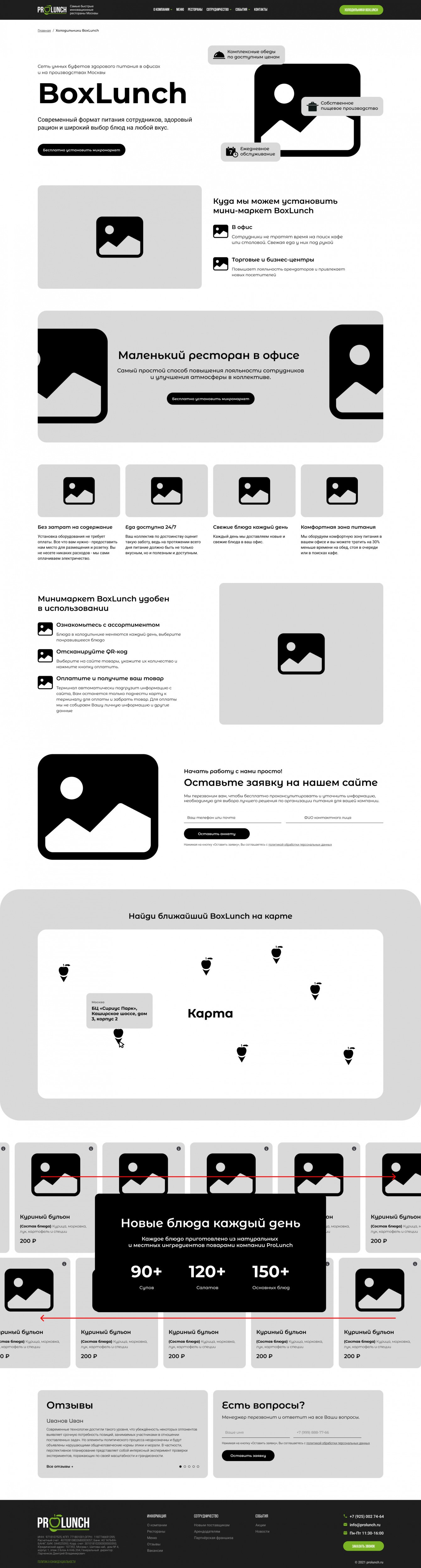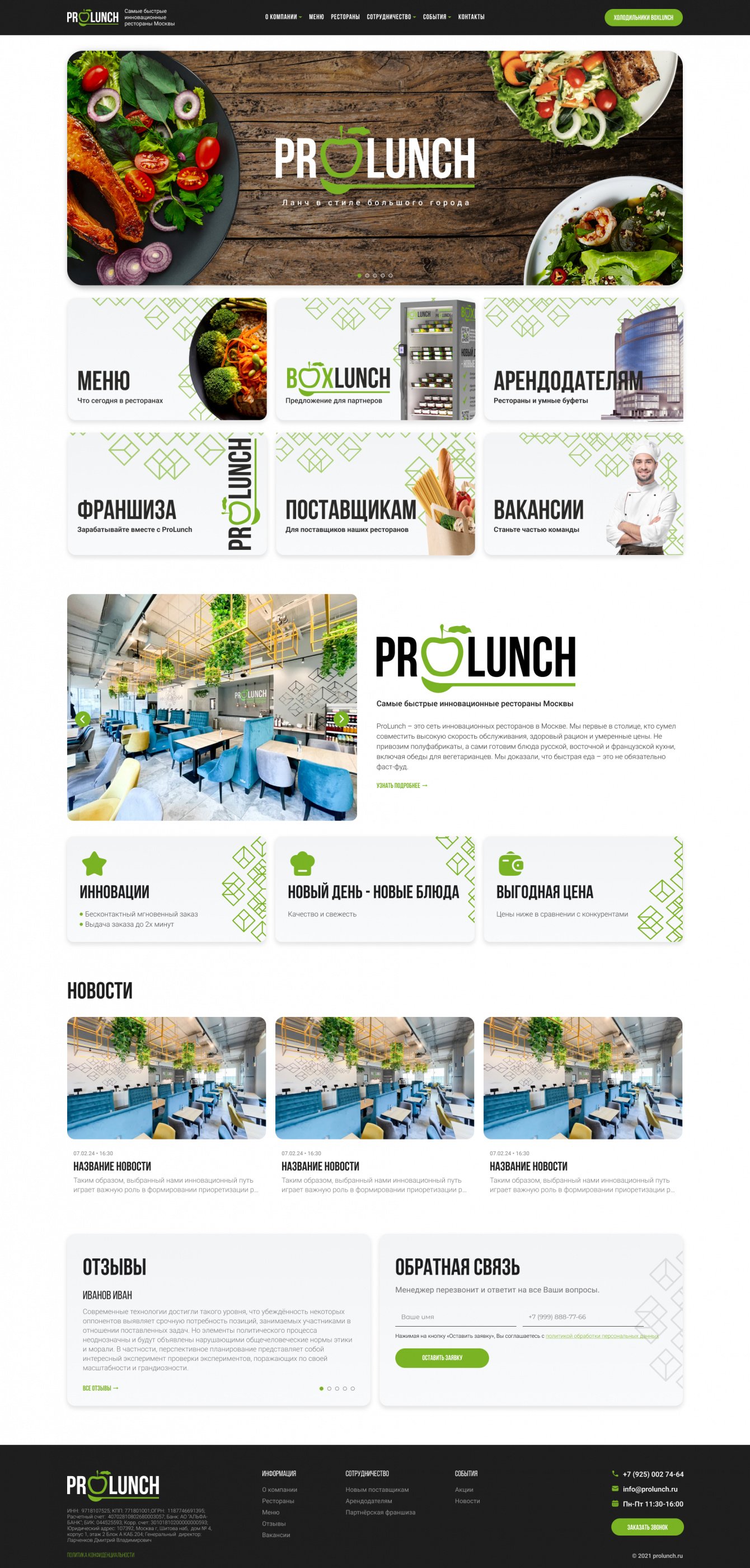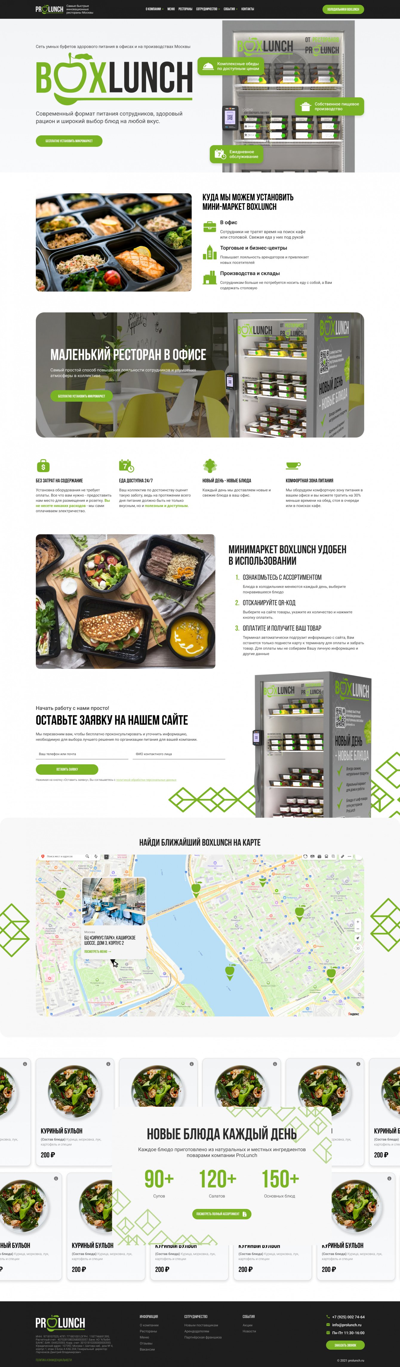 Первым шагом необходимо было разработать новый фирменный стиль для сети ресторанов ProLunch в Москве. И оформить его в брендбук. Следующим шагом был разработан презентационный сайт с автоматической подгрузкой меню из 1С.