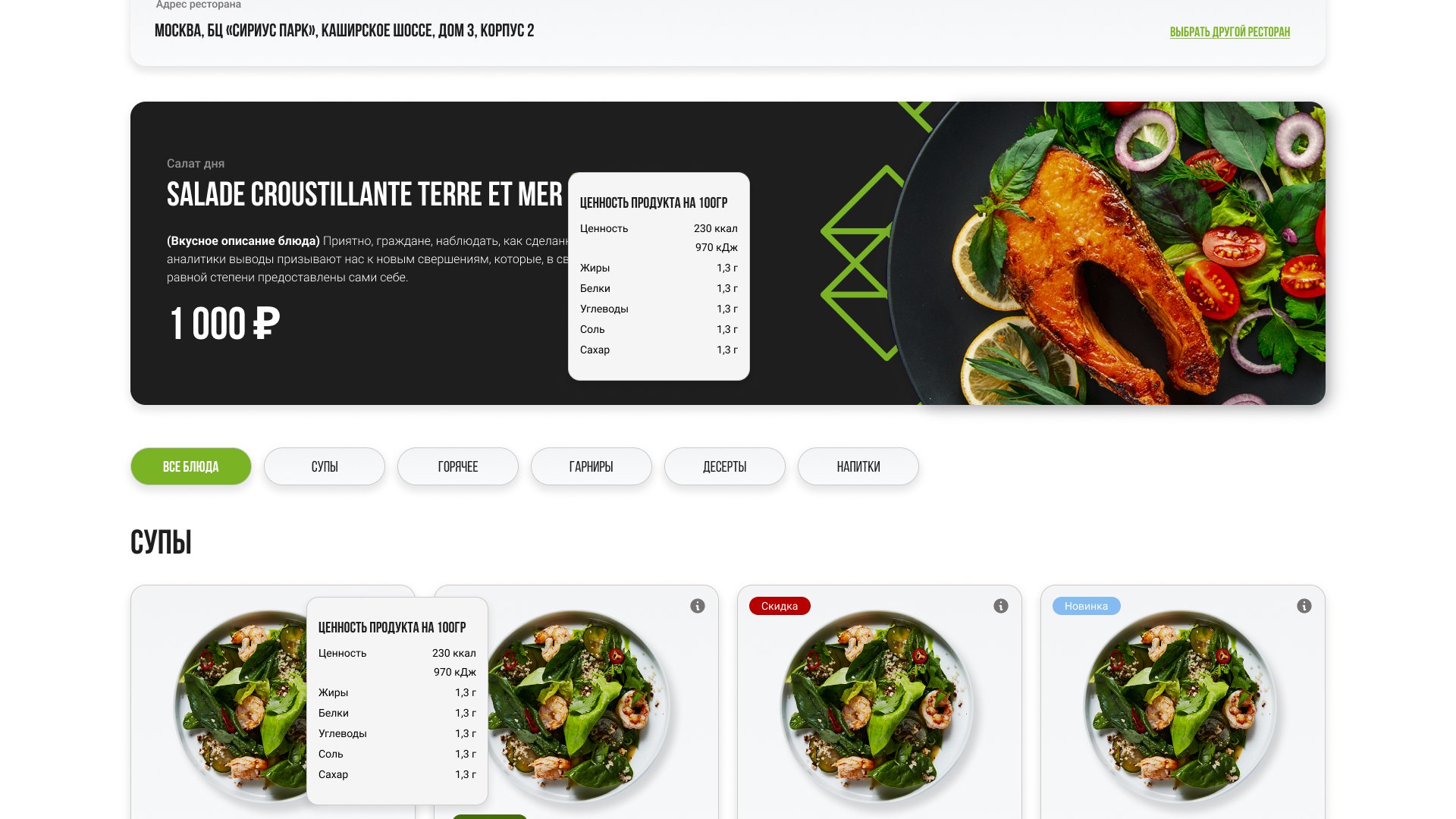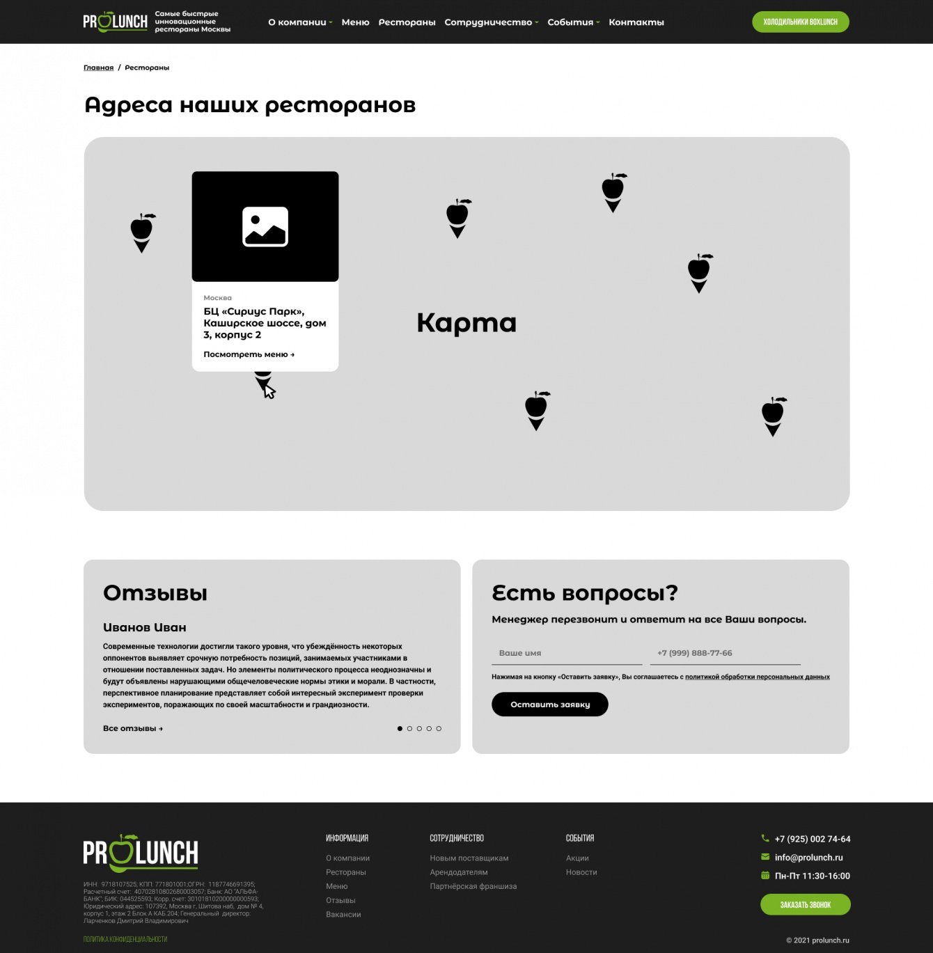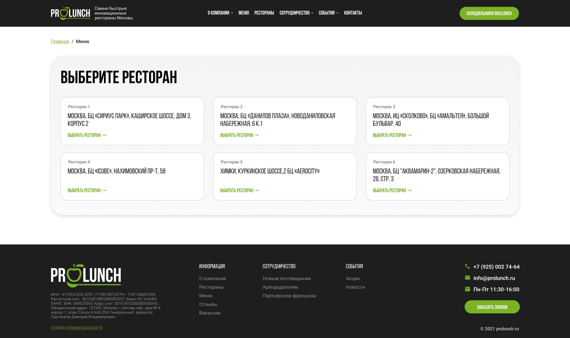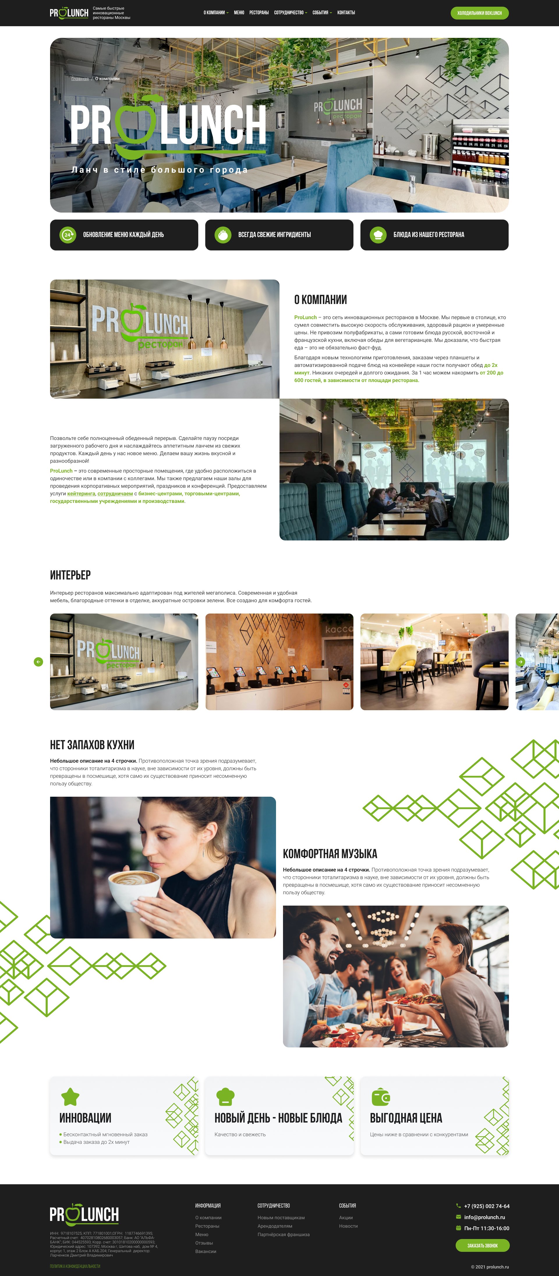 Первым шагом необходимо было разработать новый фирменный стиль для сети ресторанов ProLunch в Москве. И оформить его в брендбук. Следующим шагом был разработан презентационный сайт с автоматической подгрузкой меню из 1С.