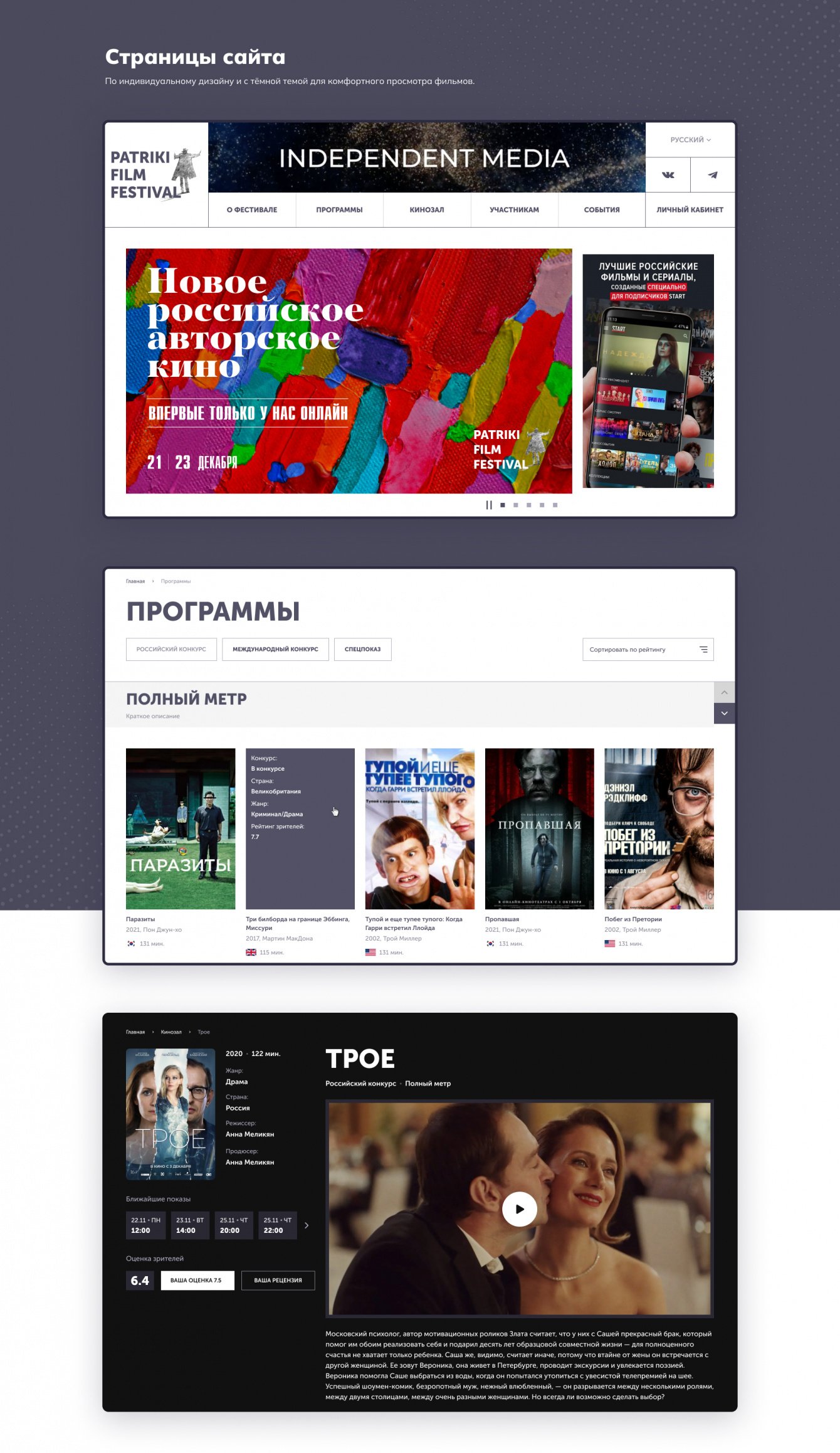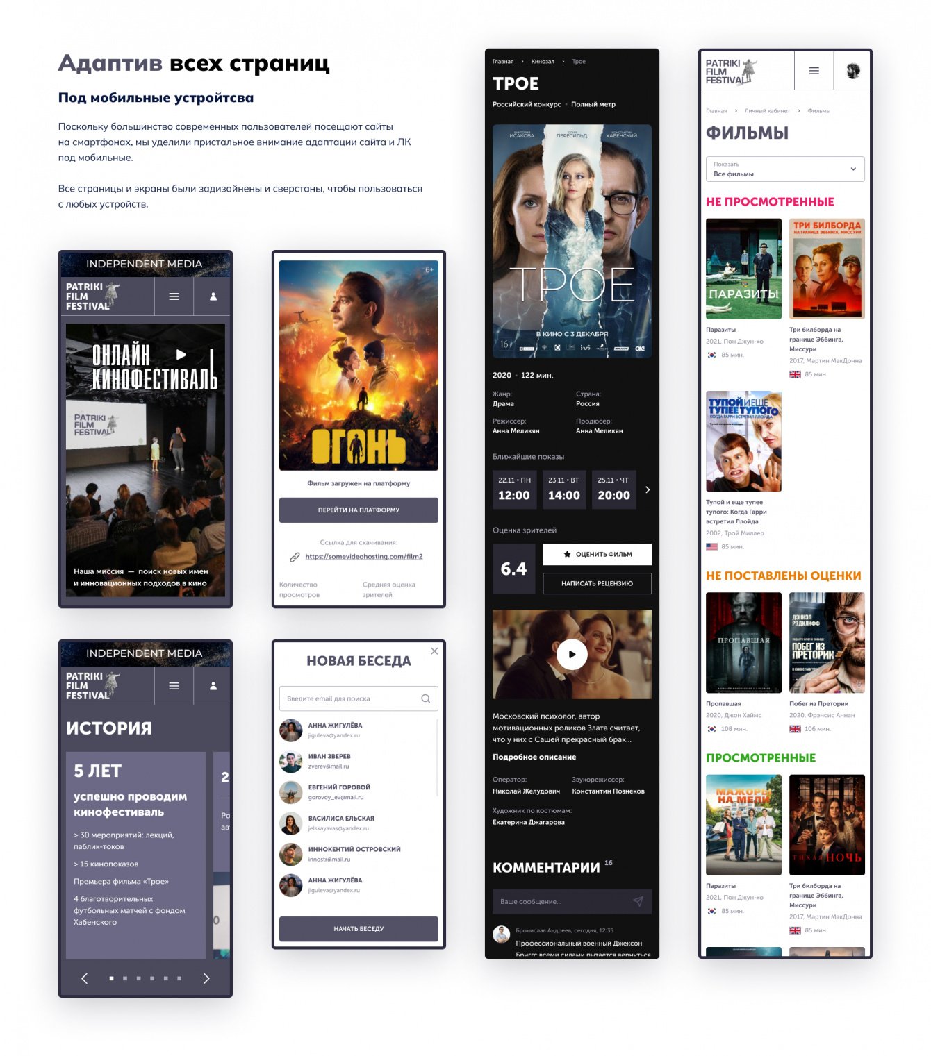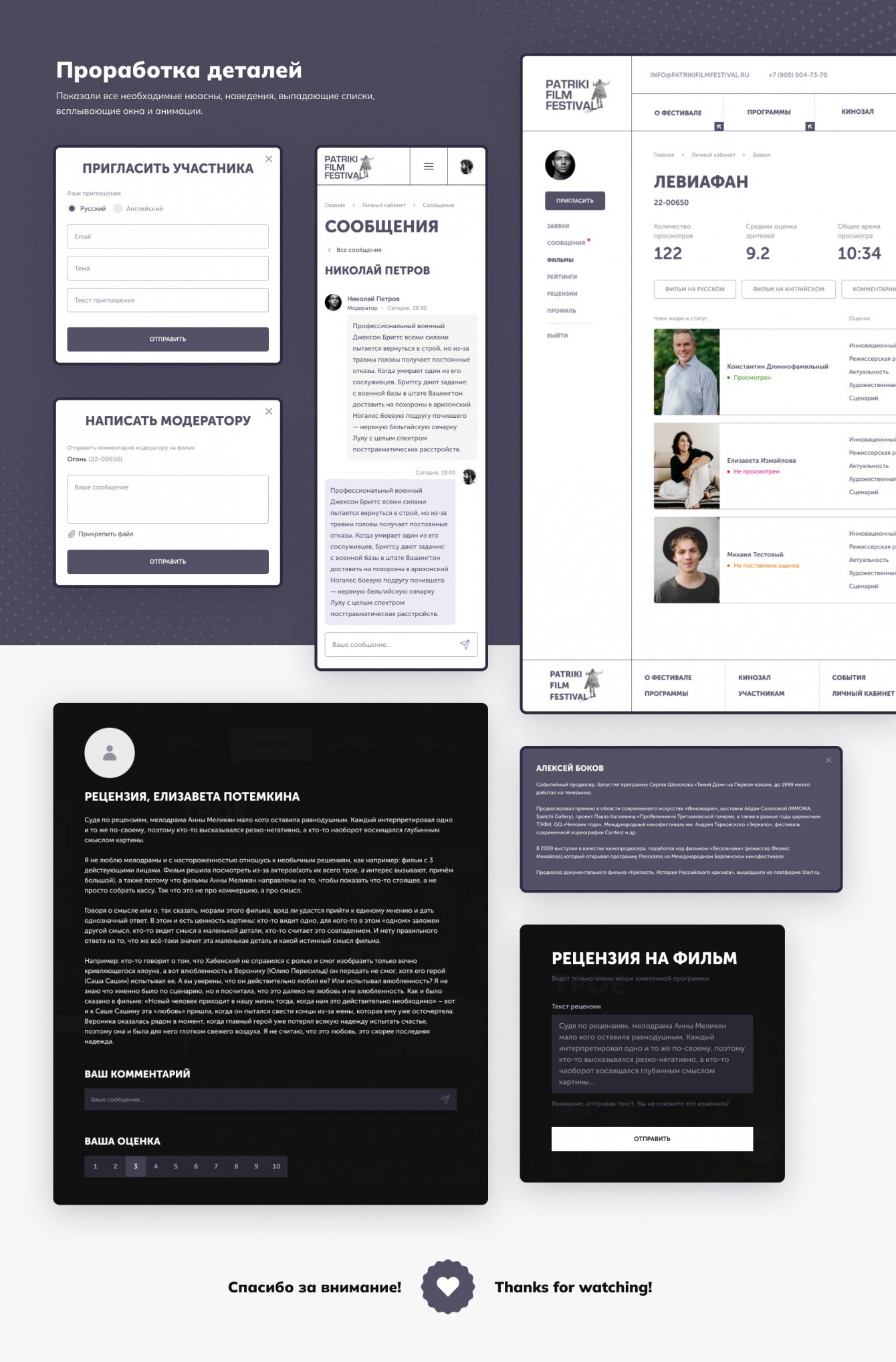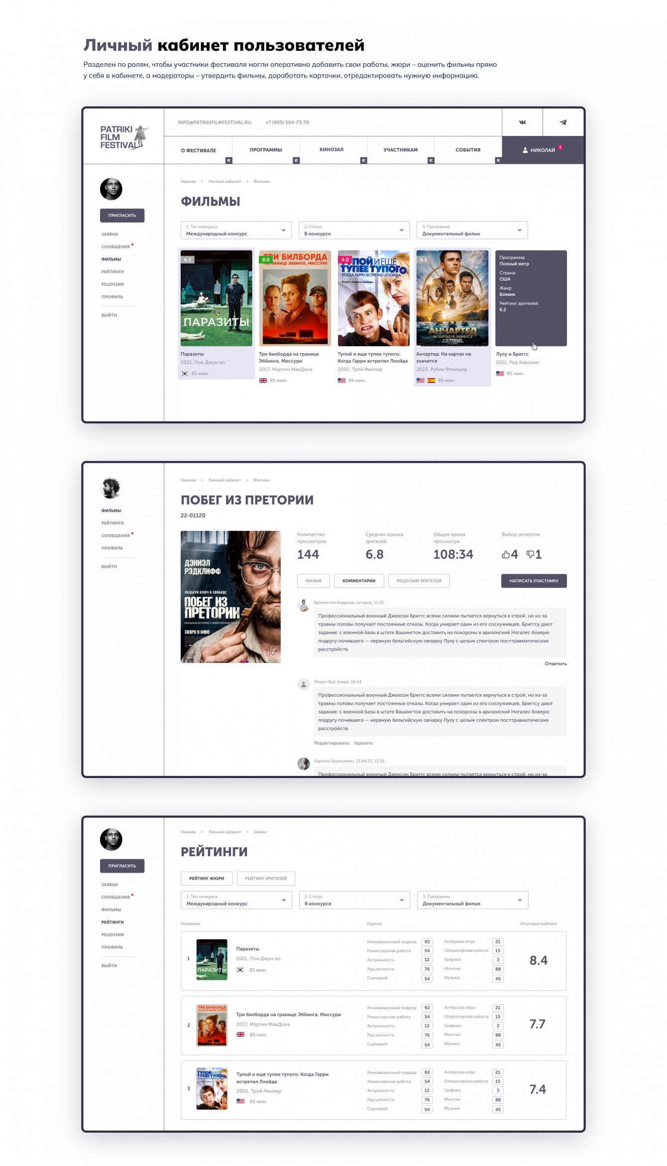 Разработали личный кабинет с широким функционалом добавления и структурирования фильмов для фестиваля, обмена сообщениями, выставления рейтинга. Пользователи были разделены на несколько ролей. Мы постарались упростить взаимодействие, чтобы использование кабинета было простым и понятным.