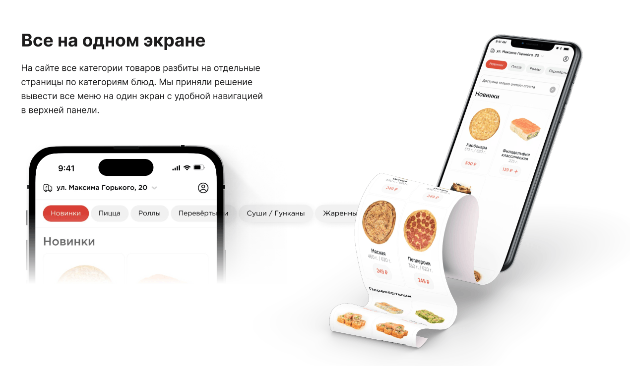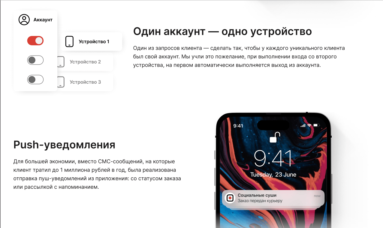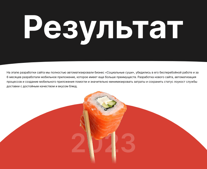 На этапе разработки сайта мы полностью автоматизировали бизнес «Социальные суши», убедились в его бесперебойной работе и за 6 месяцев разработали мобильное приложение, которое имеет еще больше преимуществ. Разработка нового сайта, автоматизация процессов и создание мобильного приложения помогли и значительно минимизировать затраты и сохранить статус лоукост службы доставки с достойным качеством и вкусом блюд.