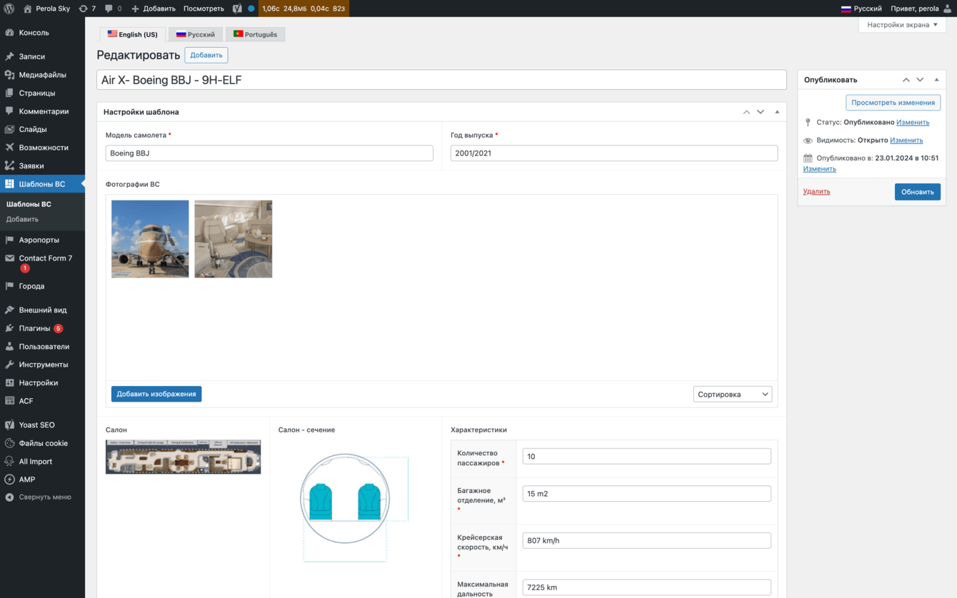 База воздушных судов. Возможность создавать/редактировать шаблоны воздушных судов с фотографиями и техническими характеристиками. Это позволяет сократить время создания предложения