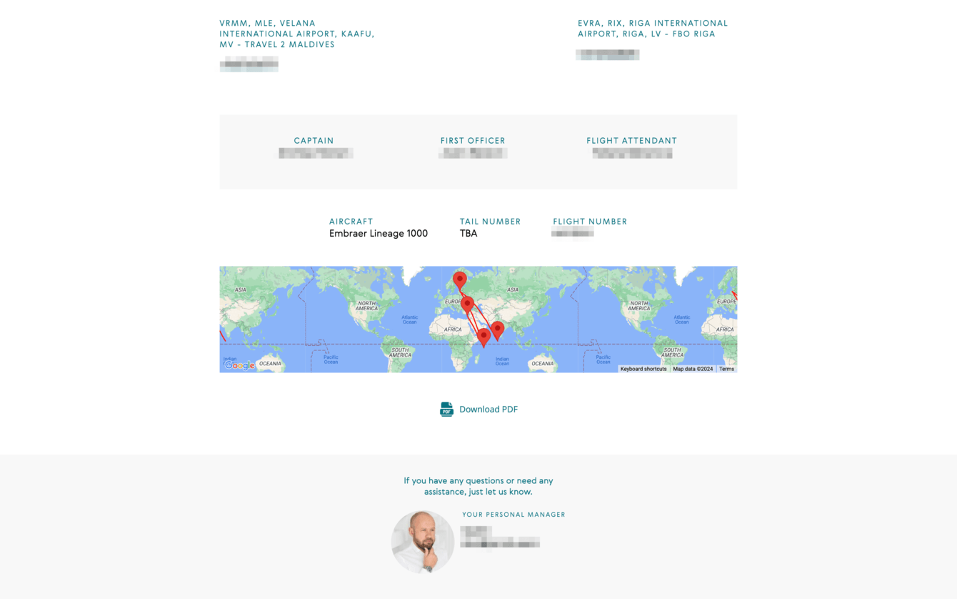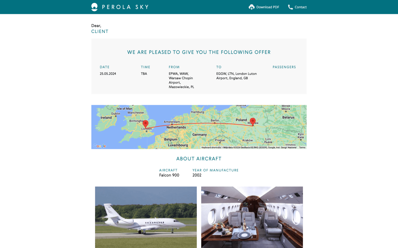 На основании выбранного предложения менеджер готовит информация о перелёте: контактные данные хендлеров, аэропортов. Данные предложения обновляются при смене этапа сделки по той же ссылке, что есть у клиента.