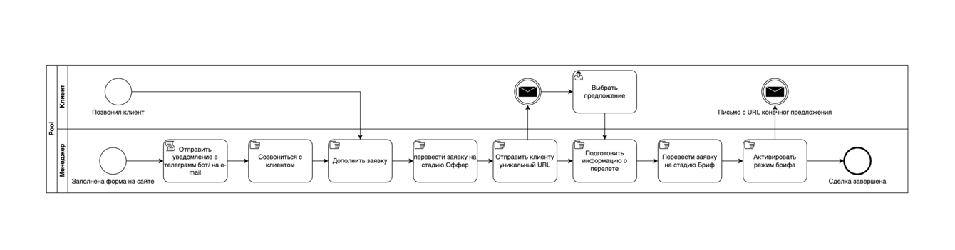 Менеджер выбирает воздушные суда и корректируют информацию по предложению. Отправляет ссылку на предложение для клиента