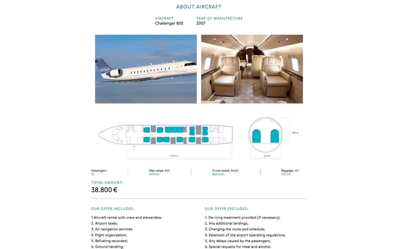 Клиент видит информацию о воздушном судне с фотографиями и схемами.