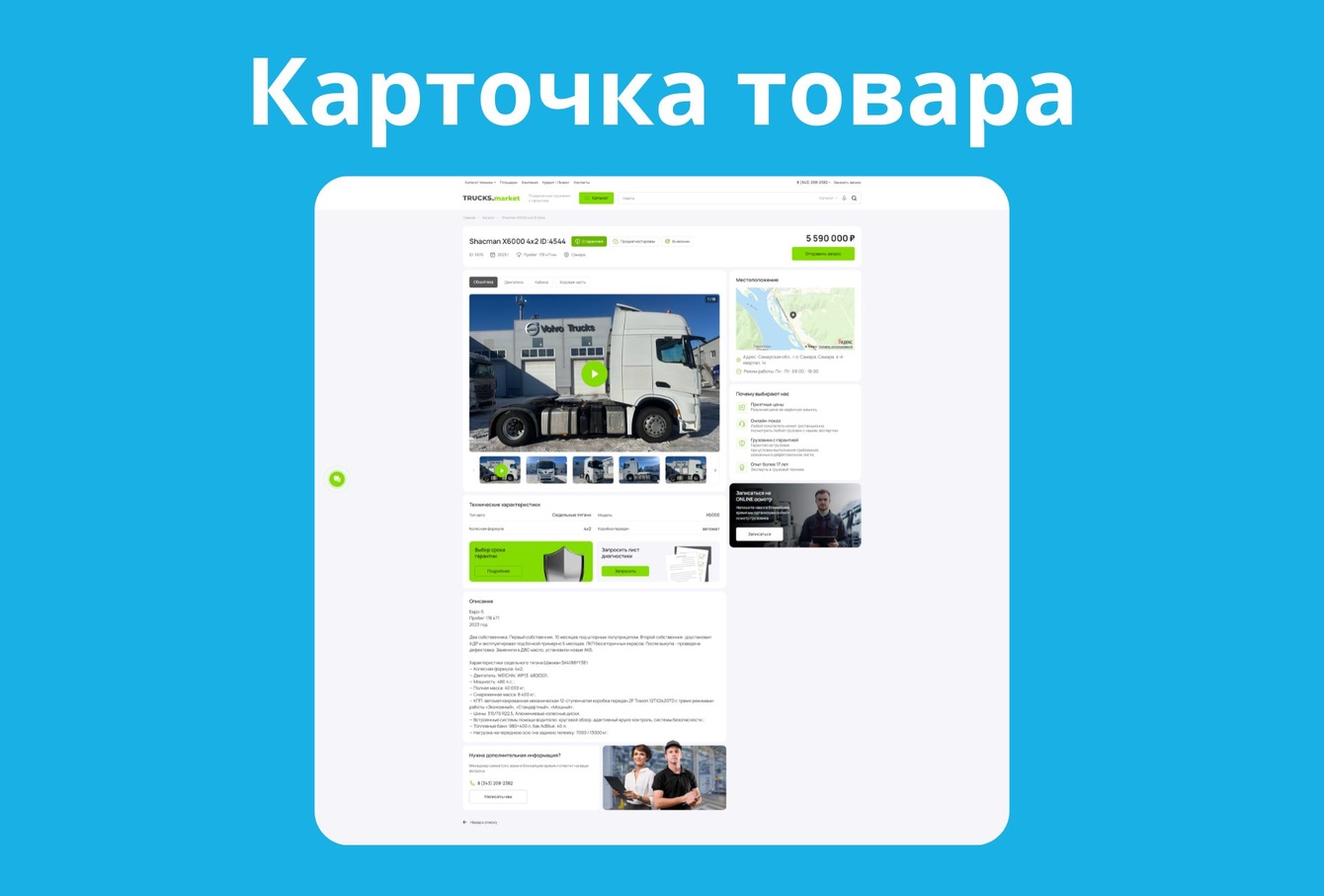 Помимо карточки техники, мы уделили внимание главной странице — она формирует первое впечатление и быстро отвечает на ключевой вопрос пользователя: «какая техника есть в наличии и почему этой компании можно доверять».
