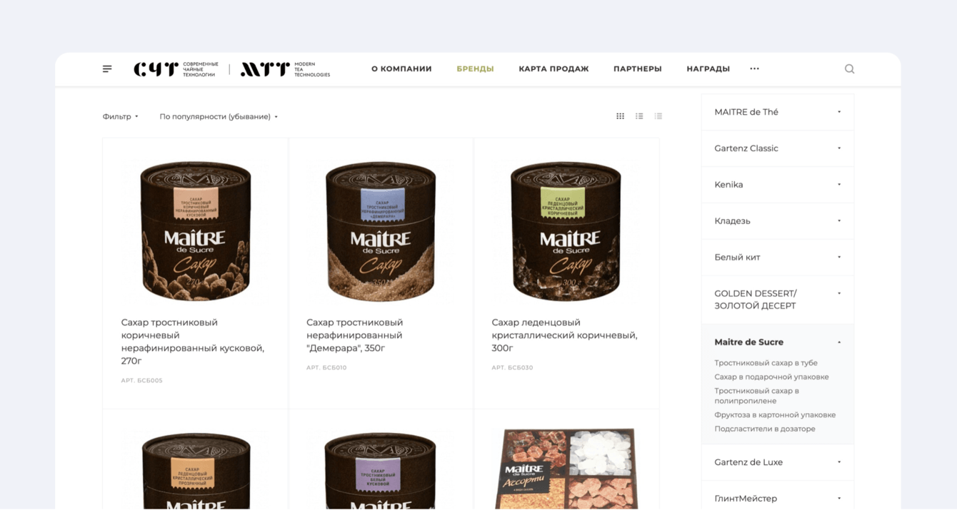У заказчика много брендов выпускаемой продукции. Чтобы пользователю было удобней в них разобраться, мы проработали удобную и понятную структуру каталога. В карточке товара выводятся все необходимые характеристики продукции.
