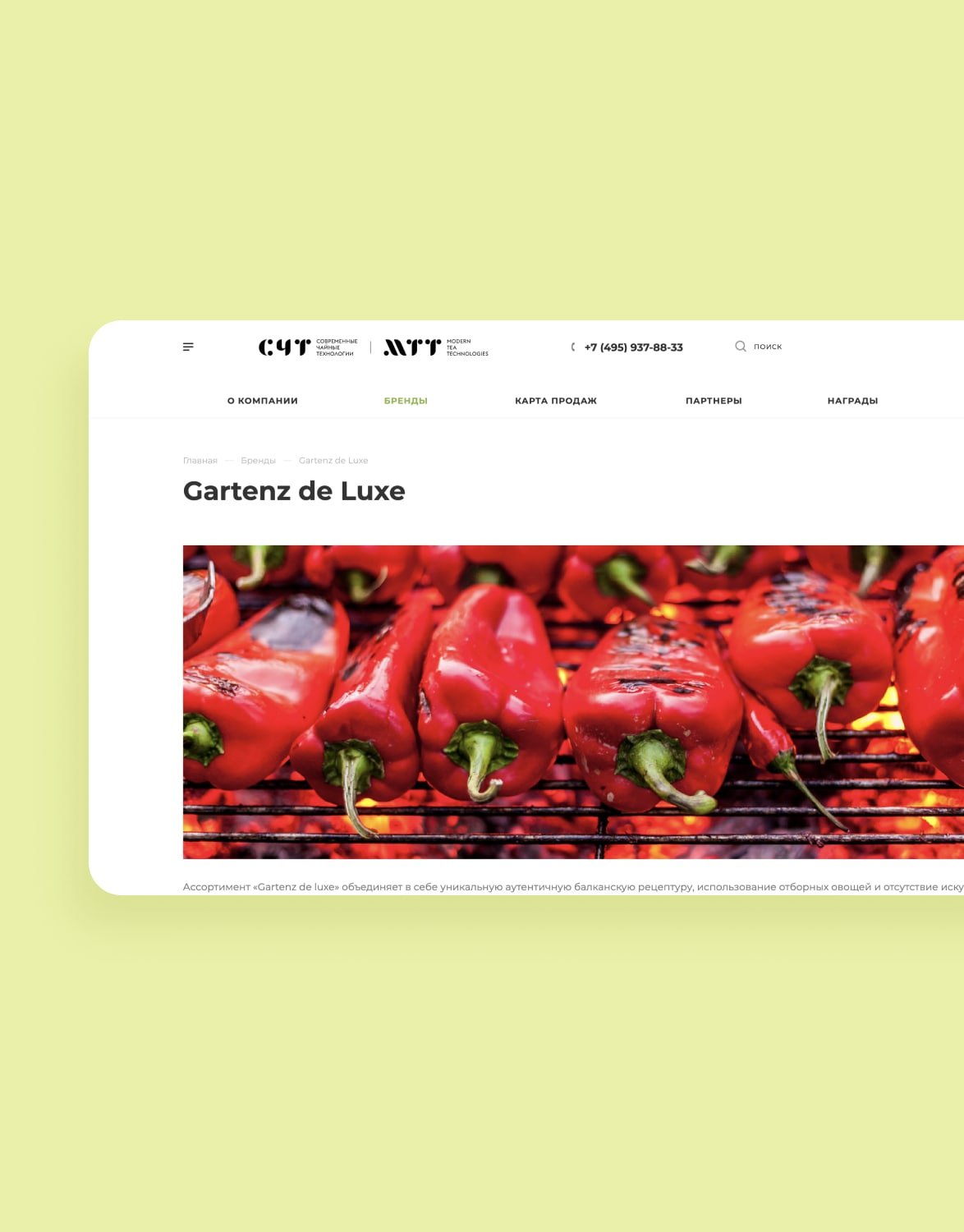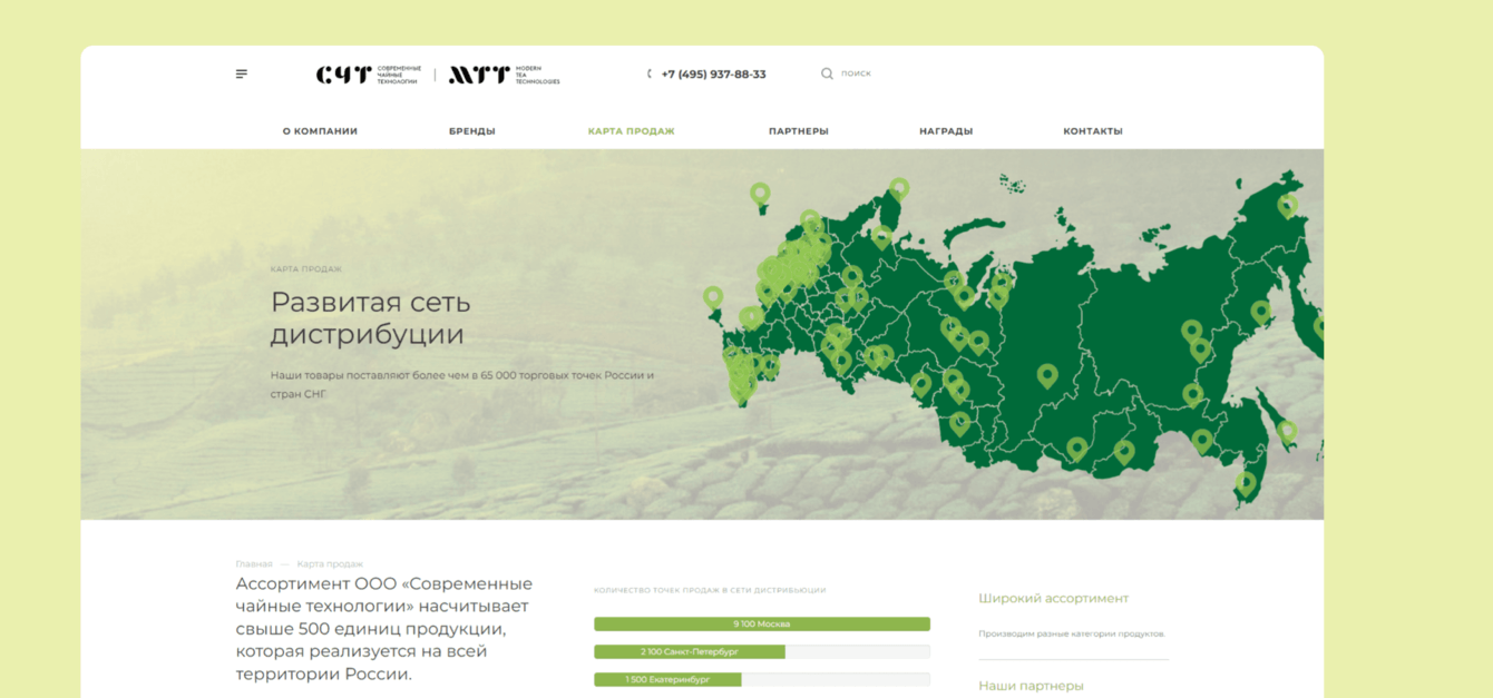 Разработали уникальную страницу с картой, на которой отмечены точки дистрибуции продукции компании, под самой картой расположили информацию о показателях продаж.
