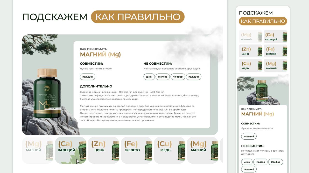 Дополнительно был создан раздел "Подскажем как правильно", где представлены советы по совместимости и противопоказаниям различных микроэлементов, что увеличивает доверие пользователей к продукции.